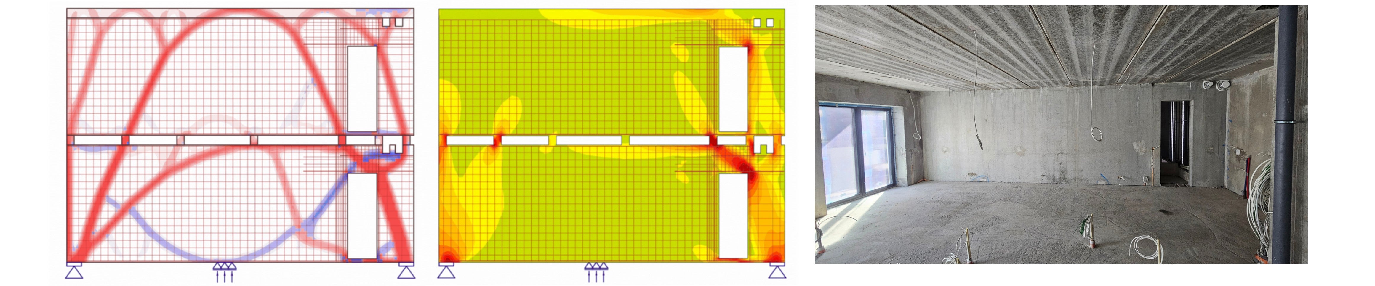 The forces from the channel plates are transferred through a wall, or through a beam to the column. For example, consider a load-bearing interior cavity wall with frame openings and an overlay cam for the floor slabs. Here the reinforcement around the openings is an important consideration. Especially when openings are added at a later date or when the wall is to function as a wall beam, a nonlinear analysis is essential. IDEA StatiCa Detail makes it possible to calculate these complex situations with precision, including checking for crack widths.