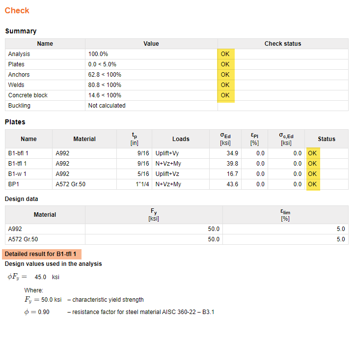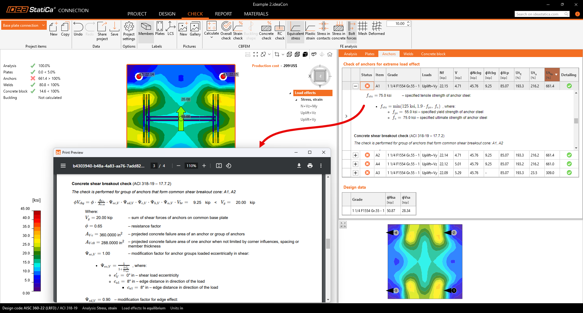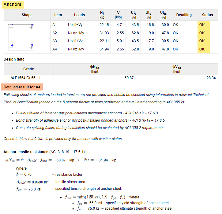IDEA StatiCa Connection uses ACI-318 (2014 or 2019) formulas from Chapter 17 to design the anchor bolts. The code results are presented in a table, and you can look at the status of each anchor's checks. The verification also considers concrete breakout strength.