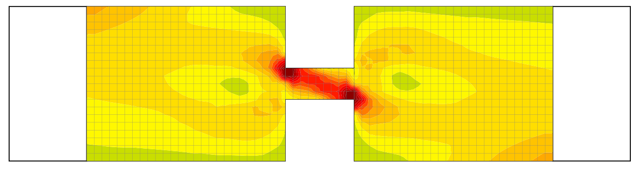 The sharp corner created at the junction of the coupling beam and shear wall creates a local stress peak which skews the model results. This peak is caused by the singularities at the point of the sharp re-entrant corner. The question is how to deal with these peaks in the models themselves. Find out more here.
