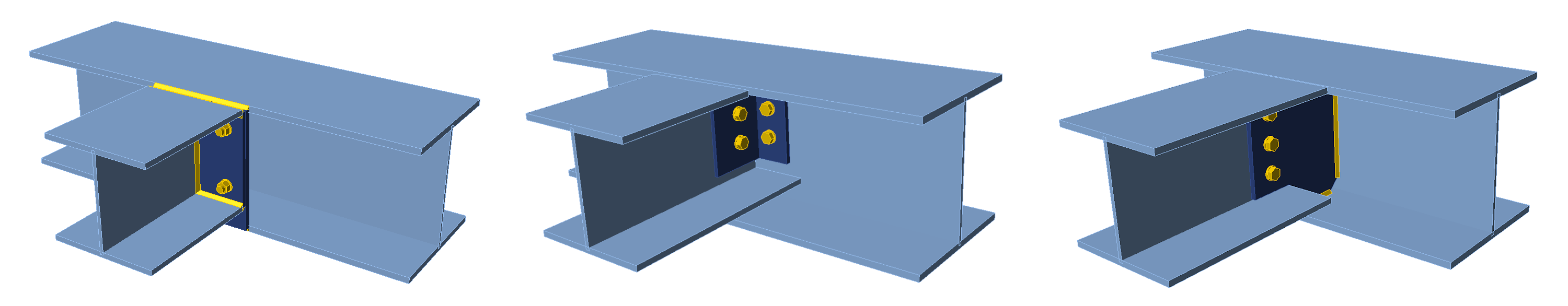 • Cleat connection: A cleat, typically made of a steel angle section, is bolted to the webs of both beams. This connection is commonly used in situations where a moment connection is not required.