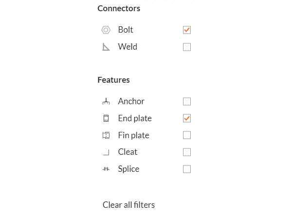 The whole database is segmented and filterable by a smart system of connection geometries. What does it mean? Using a few setting parameters, you can model your connection members quickly with a predefined set of cross-sections and filters.