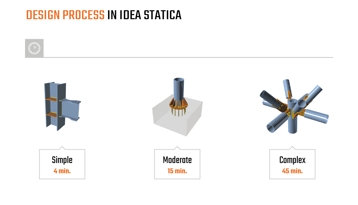 We are comparing the data of how laborious is each type of connection with benchmark values we have collected from our customer base of 3700 engineering offices and fabricators.  A skilled structural engineer or detailer using IDEA StatiCa can design steel connections in minutes: