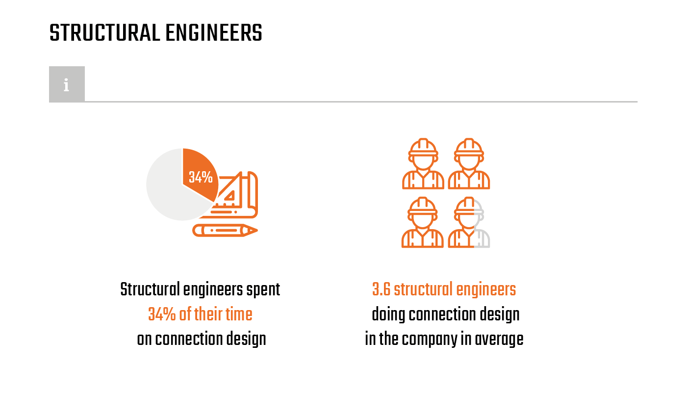 Based on the respondent's answers, the connection design (including everything from pre-design, calculations, reports, revisions, necessary sketches, or detailing) takes on average 34% of the engineer's time. That means approx. 54 hours monthly per person (considering 160 man-hours per month). This all with their current tools, i.e. before implementing IDEA StatiCa.