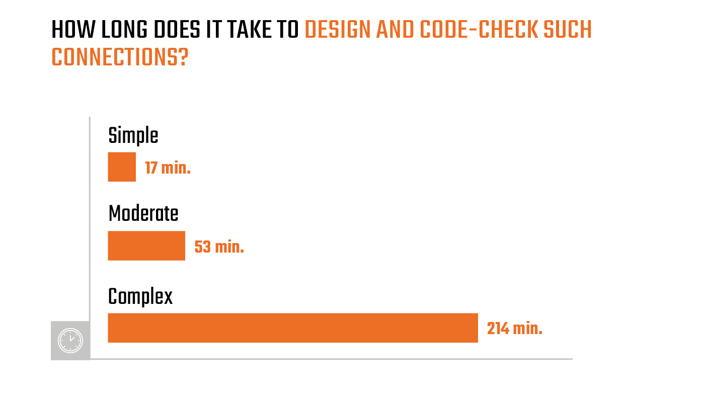 Engineers spent approx. 17 minutes to design and code-check a simple steel connection, including the creation of all the necessary reports and outputs for authorities and other stakeholders.  For complex connections, this goes to hours. Our data inputs vary a lot, with an average value of about 214 minutes.