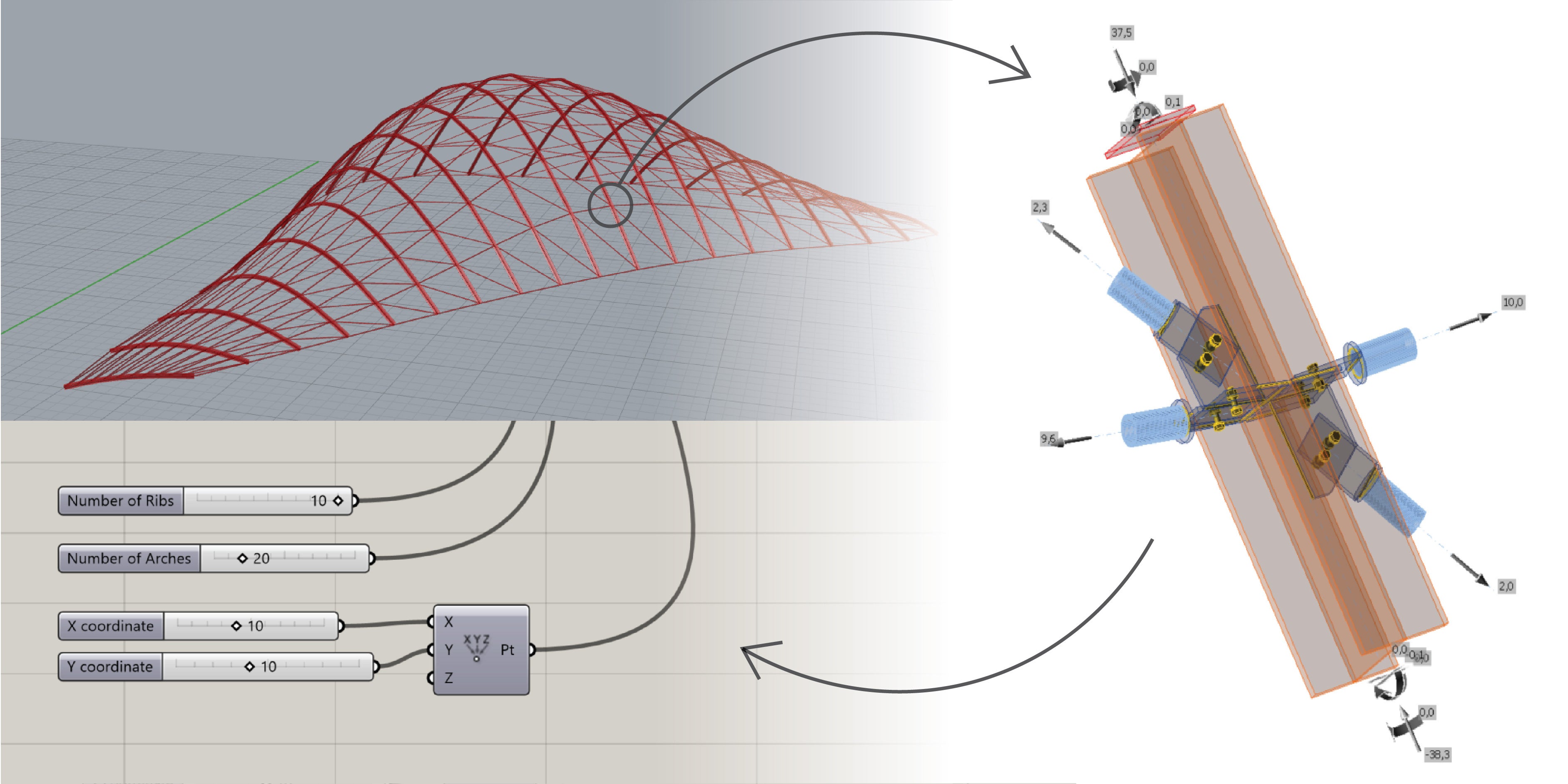 Karamba3D, one of the software packages used in the workflow, is a parametric structural engineering tool that provides accurate analysis of spatial trusses, frames, and shells. Karamba3D is fully embedded in the parametric design environment of Grasshopper, a plugin for the 3D modeling tool Rhinoceros. This makes it easy to combine parameterized geometric models, finite element calculations and optimization algorithms like Galapagos.