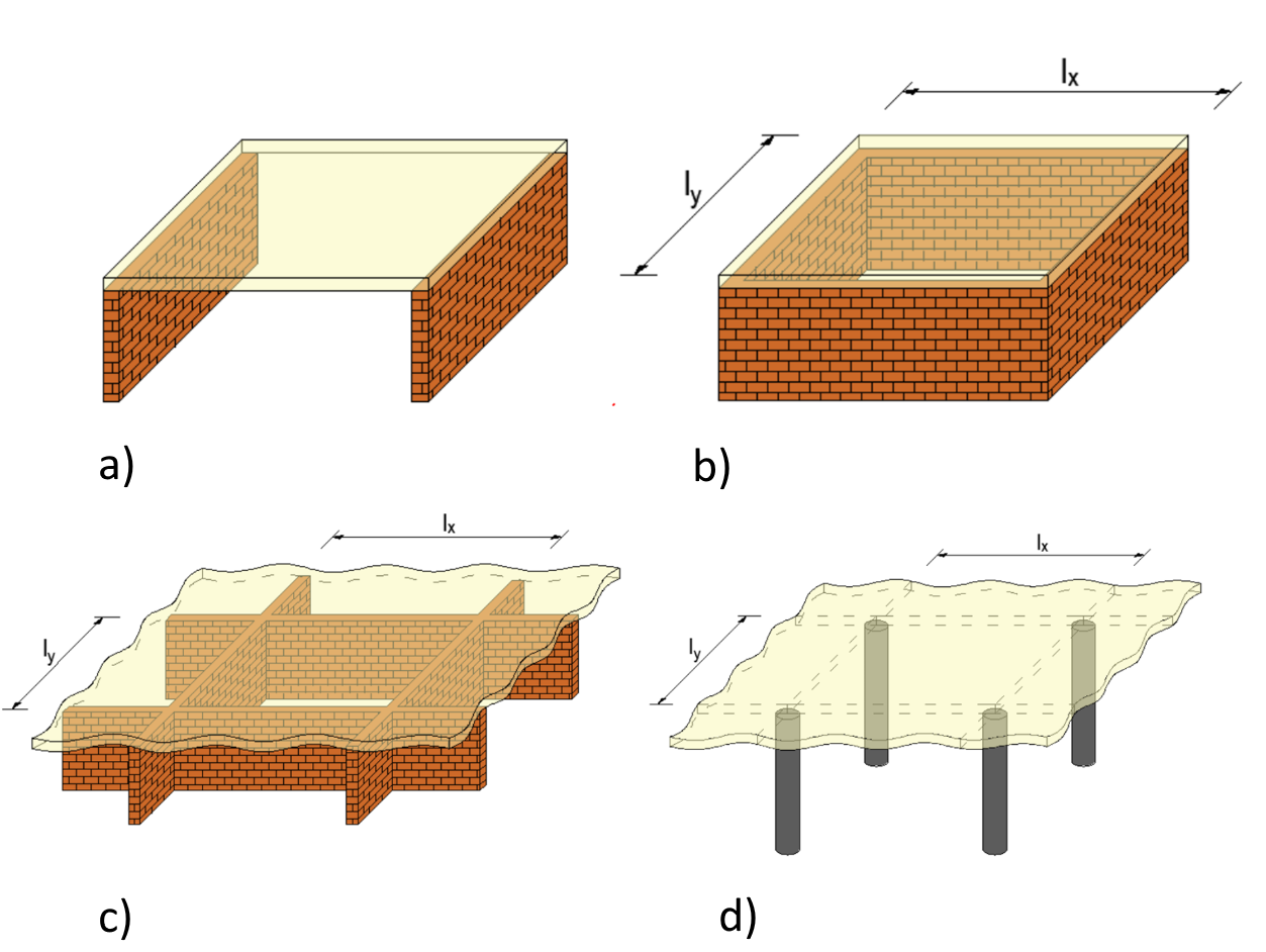 a) One-way slab, b) Two-way slab, c) Continues plate - walls, d) Continues plate - columns