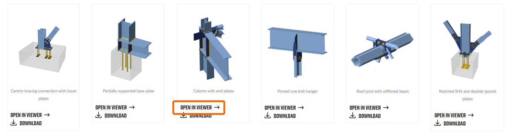 In the Sample Projects gallery, each connection can be downloaded or opened directly in IDEA StatiCa Viewer.