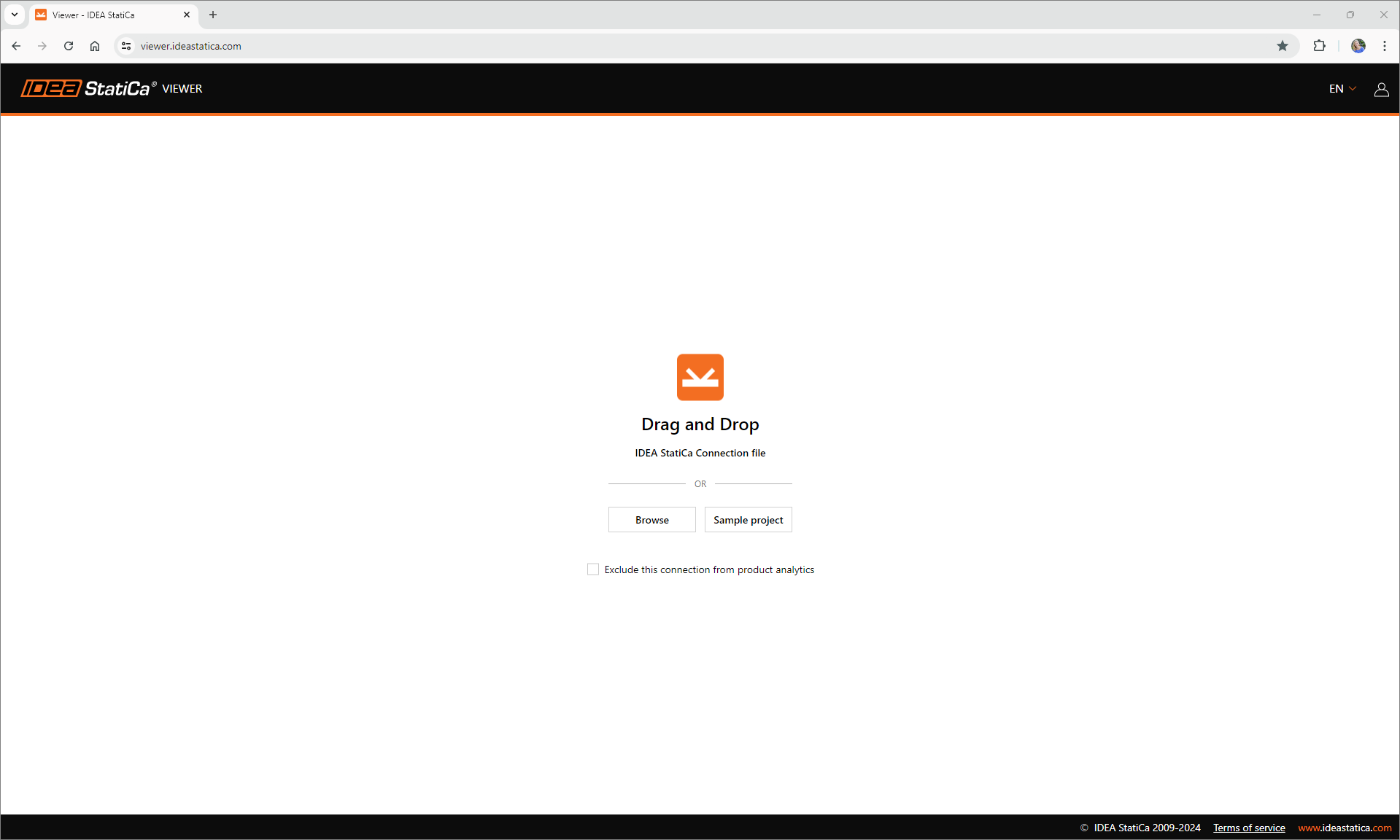 The Viewer is located in the cloud and can be opened from https://viewer.ideastatica.com/ or from the starting screen of IDEA StatiCa desktop application. Open any connection project (.ideacon file) either from the icon or use the drag&drop feature. You can also open a sample project to see what's inside.