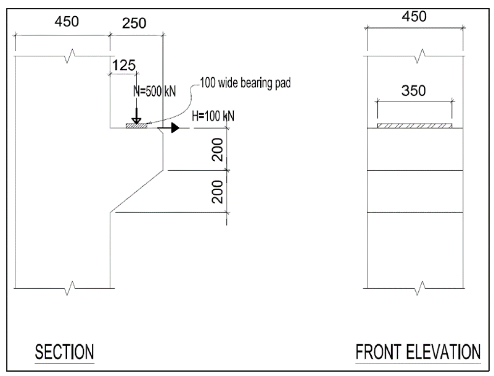 We have a corbel with given geometry, properties, and reinforcement stressed by normal and shear force as in the image below.