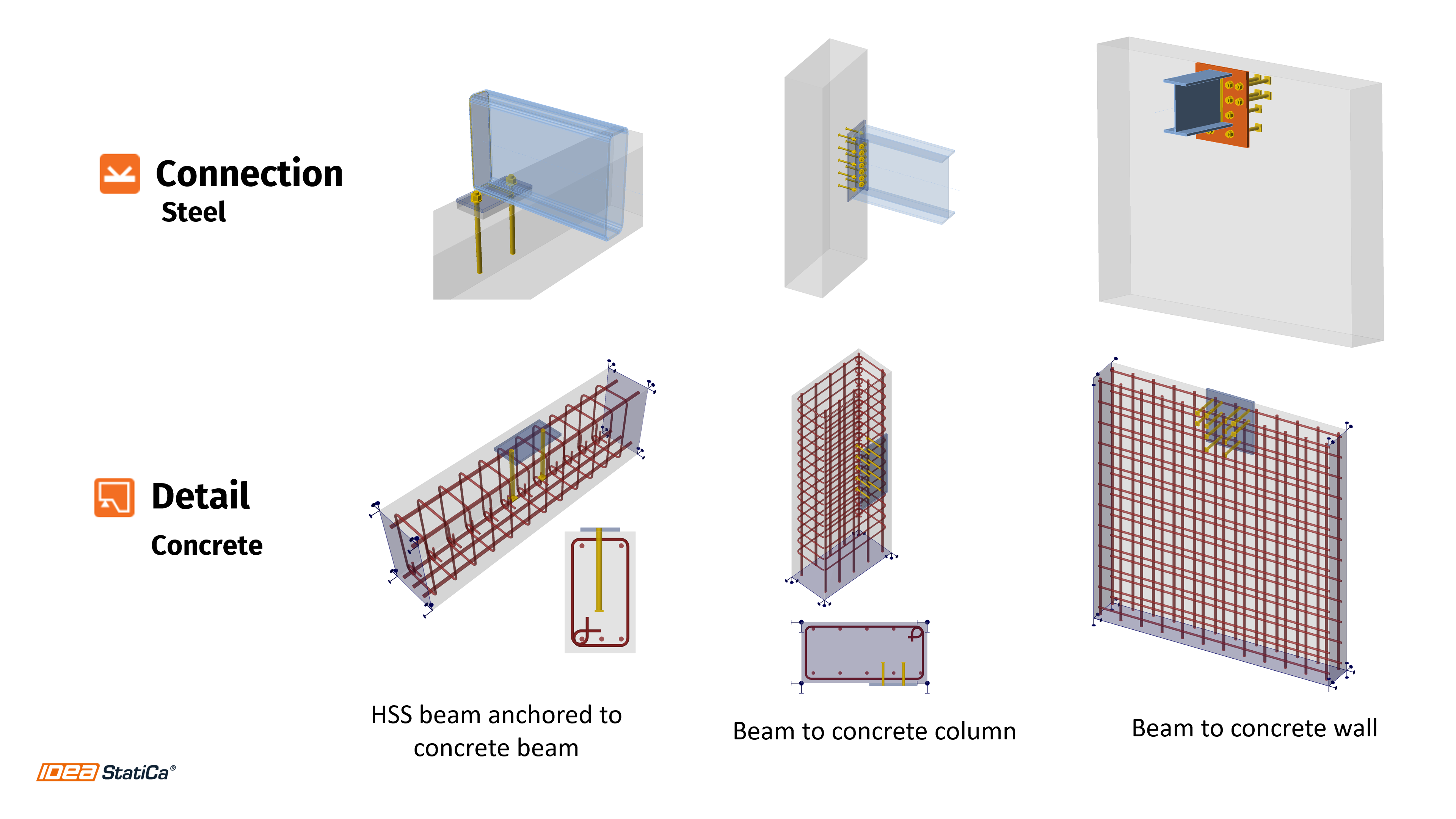 The Connection and Detail apps integration offers a variety of cases that can be analyzed and designed. This article focuses on steel beam connections to concrete elements such as walls, columns, or beams.