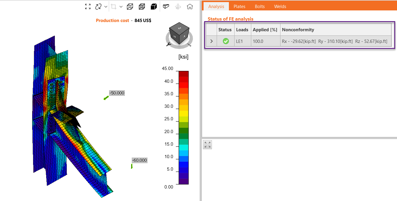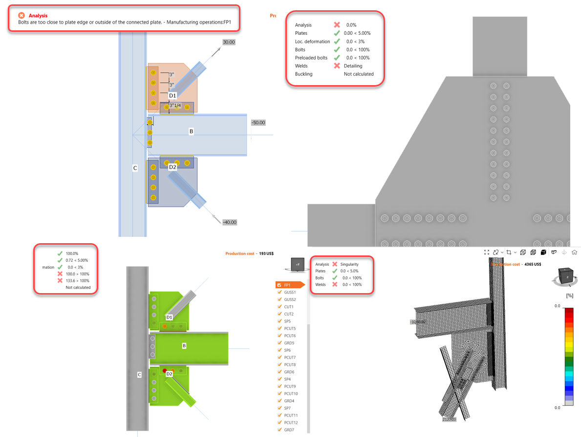 IDEA StatiCa checks bolt spacing and weld sizes required by AISC. If one or more detailing checks do not comply, the software will tell you that there is a detailing warning. Please take a look at the following picture.