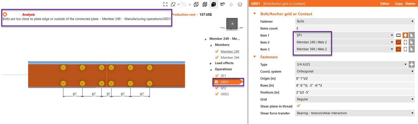 To learn more about the bolts or welds that don't comply with the code, go to the Check tab>Bolt/weld tab results>Review the detailing column and find the item failing. Click on the plus icon to open the calculation report and see the detailed warning.