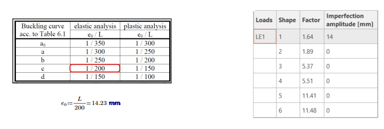 In accordance with EN 1993-1-1, the inclusion of imperfections is crucial to the integrity of any analysis. The local imperfections are contingent upon the buckling curve, as outlined in Table 6.1, and the classification of the section. In light of the SHS 50/50/3's classification under buckling curve C, the corresponding local imperfection is 14 mm.