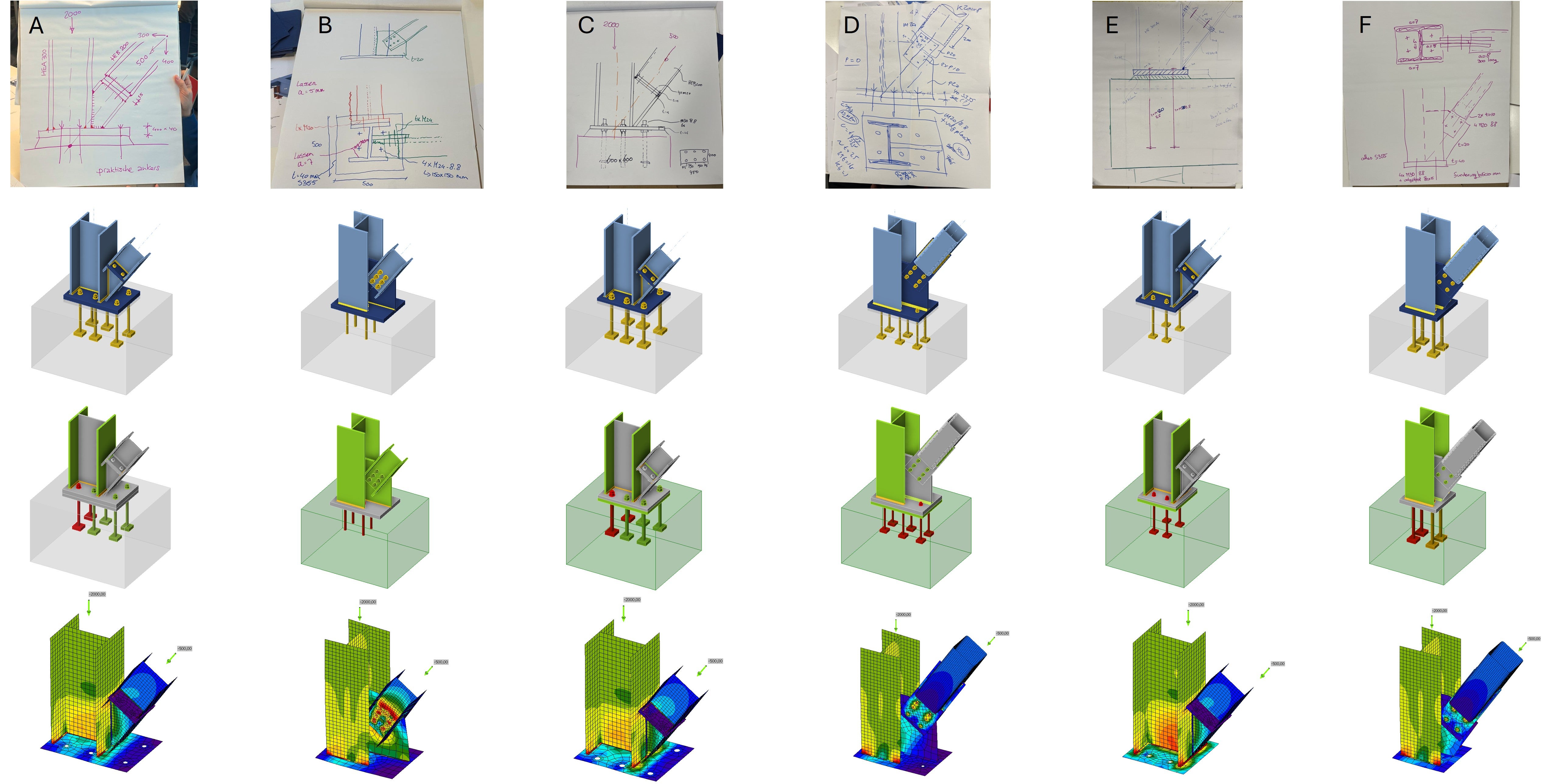 Below is an overview of the connections, sketches and models worked out in the steel connection software IDEA StatiCa. We then discuss each connection and highlight key insights from the discussions and results.