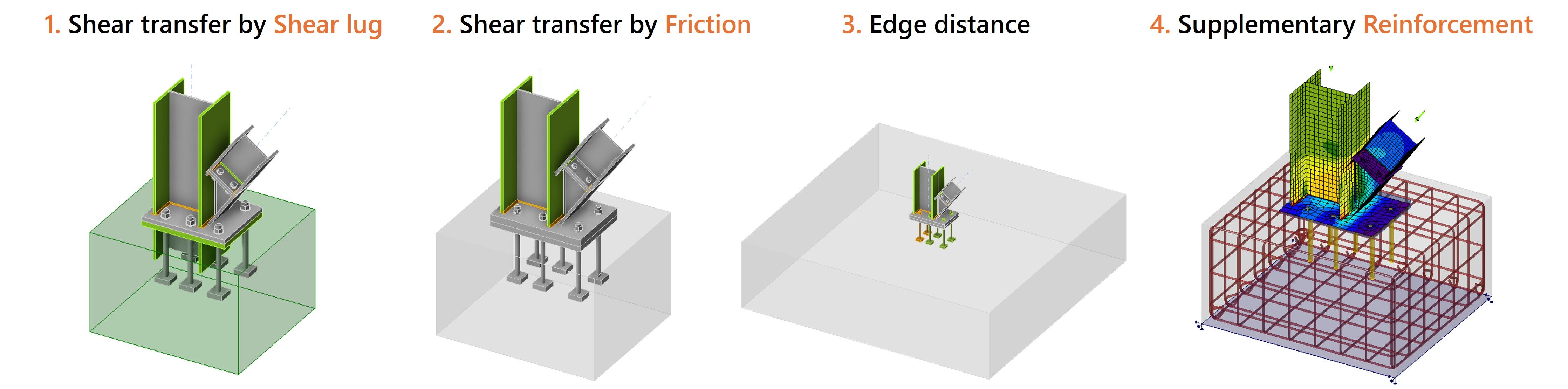 4. Design Supplementary Reinforcement in the concrete block. In this way, the steel reinforcement resists tensile forces and prevents concrete breakout. This solution can be modeled and analyzed using IDEA StatiCa 3D Detail.
