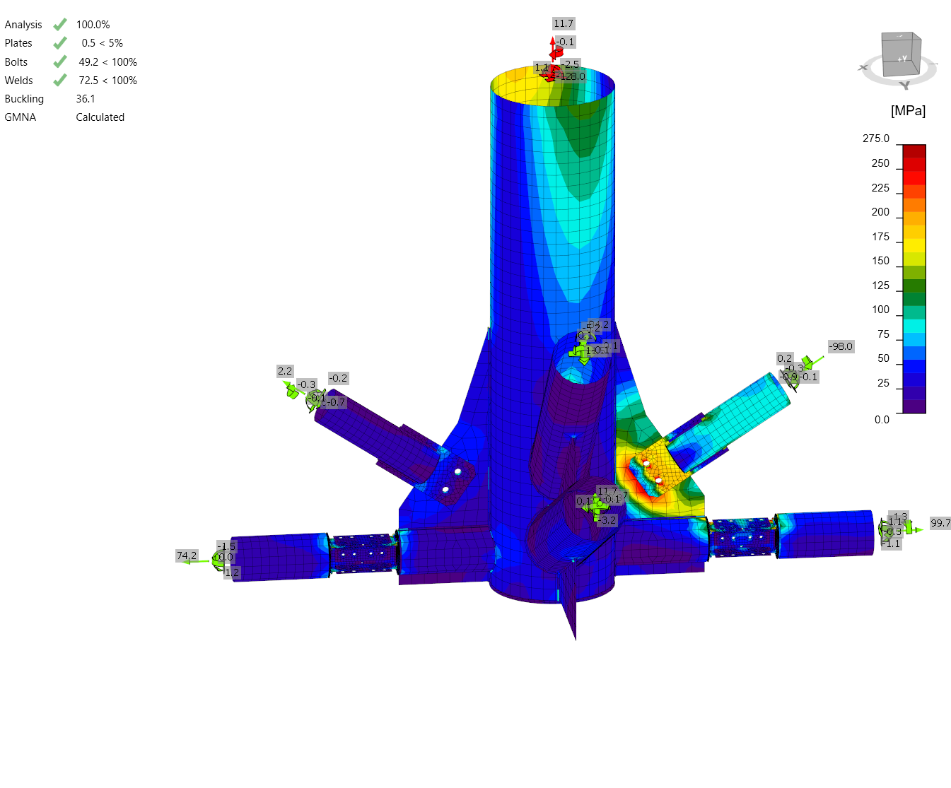 Due to the complex geometry of the connections, the approach adopted in their design was based on an iterative process. This would be very time-consuming due to tedious modeling if it weren't for the BIM link option between IDEA StatiCa and Tekla Structures. IDEA StatiCa Connection was then used mainly to analyze the behavior of the connections.
