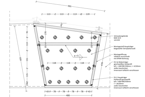 The design report with calculations and checks was submitted to the proofing engineer (Prüfstatiker) as required by the German regulation. The proofing engineer approved the calculation.