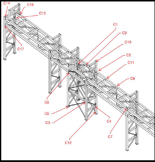 - Frame type: Typical industrial pipe rack consisting of moment frames, braced frames, and multi-bay modules