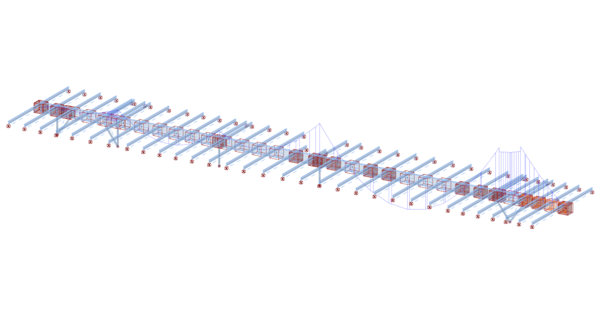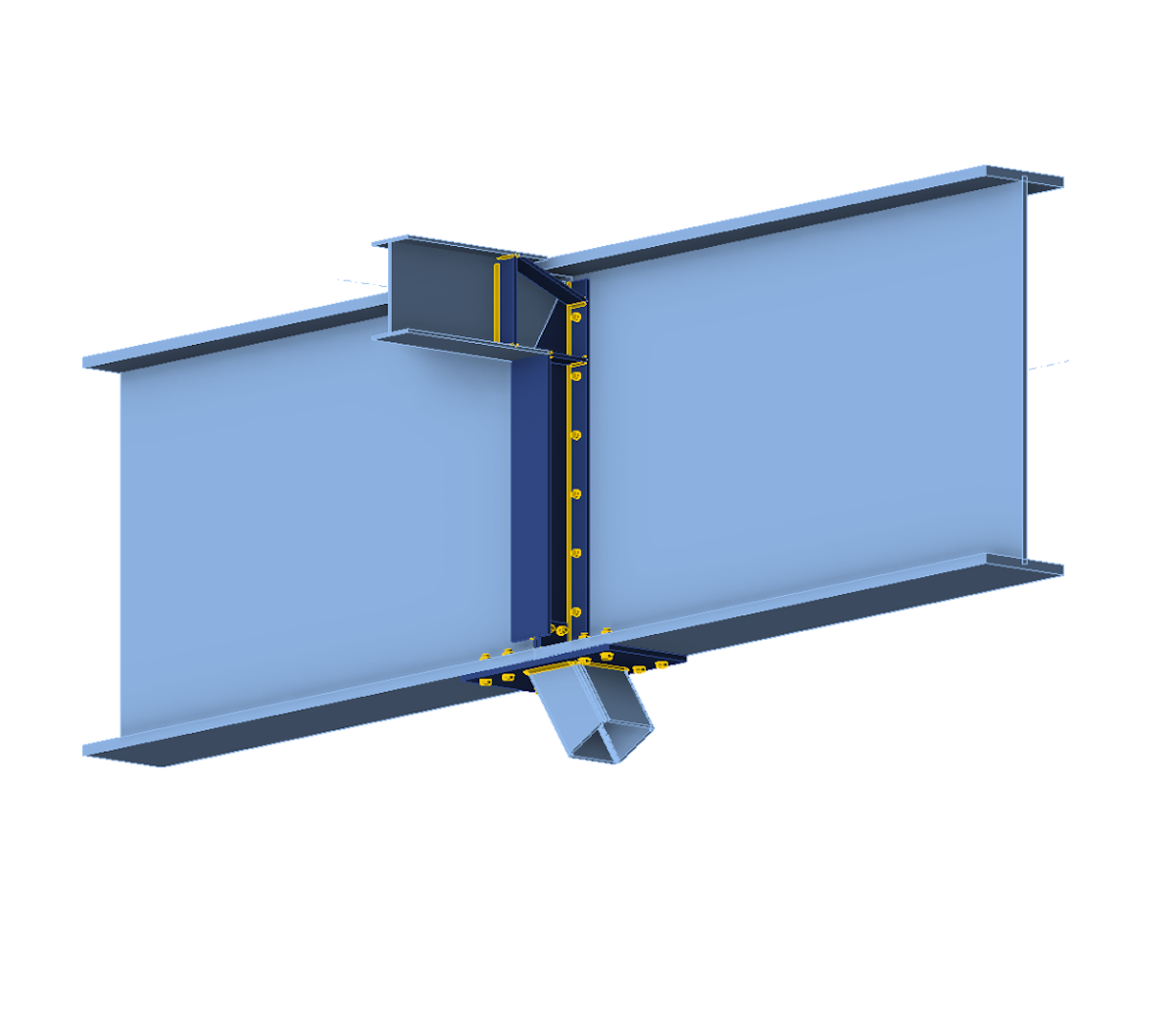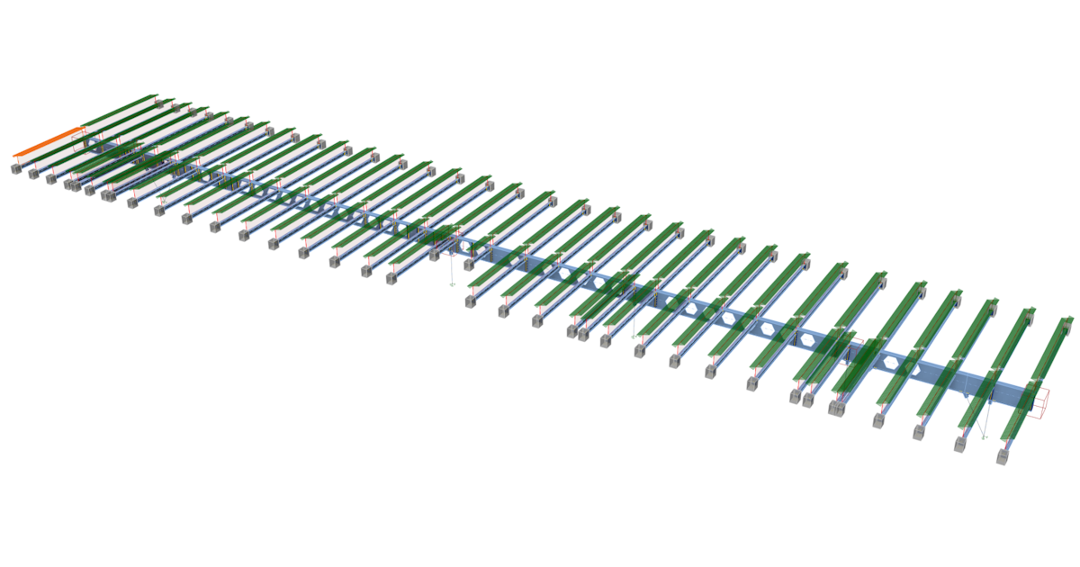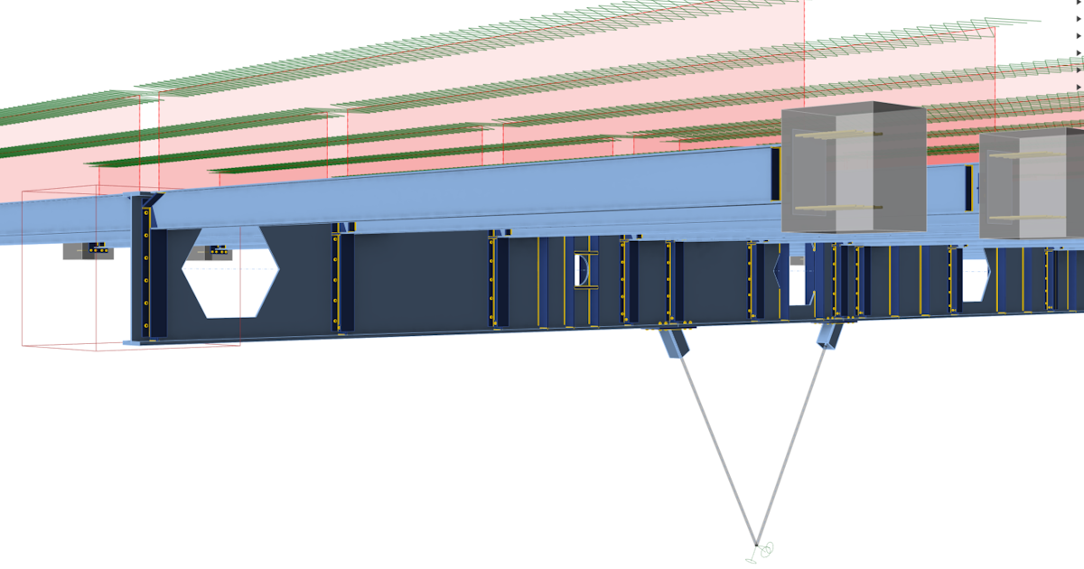 As previously mentioned, stability issues were addressed by connecting "secondary beams" to the sides of the castellated beam. The design leveraged the bending stiffness of the secondary beams, extending this stiffness to the lower flange of the castellated beam through a robust connection design. This approach effectively stabilized the lower flange. In essence, the connection between the secondary and castellated beams was so robust and stiff that it caused the secondary beams in adjacent spans to function as continuous beams, thereby influencing the distributions of loads and internal forces, which in this case also meant transferring more load to the castellated beams.