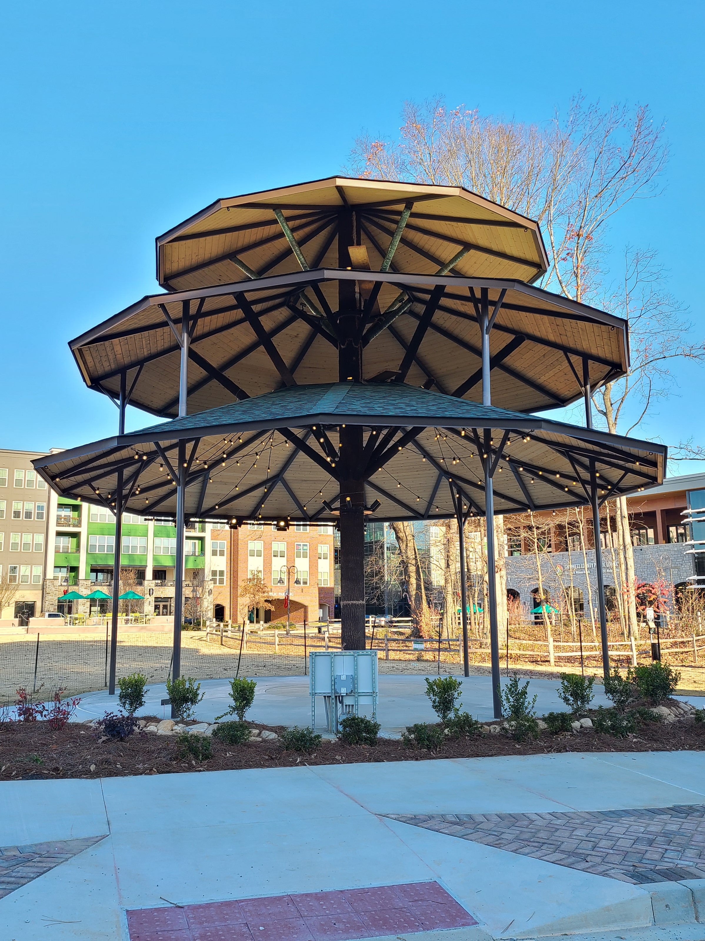 The architectural project objective was to construct a sculpture that resembled a tree. The structural result was a steel frame pavilion/bandshell with a tiered canopy and branch system. However, the project iterated several times through various configurations, including a glass geodesic dome and steel fin leaves, before ultimately ending up as an HSS and steel pipe frame with wood decking.