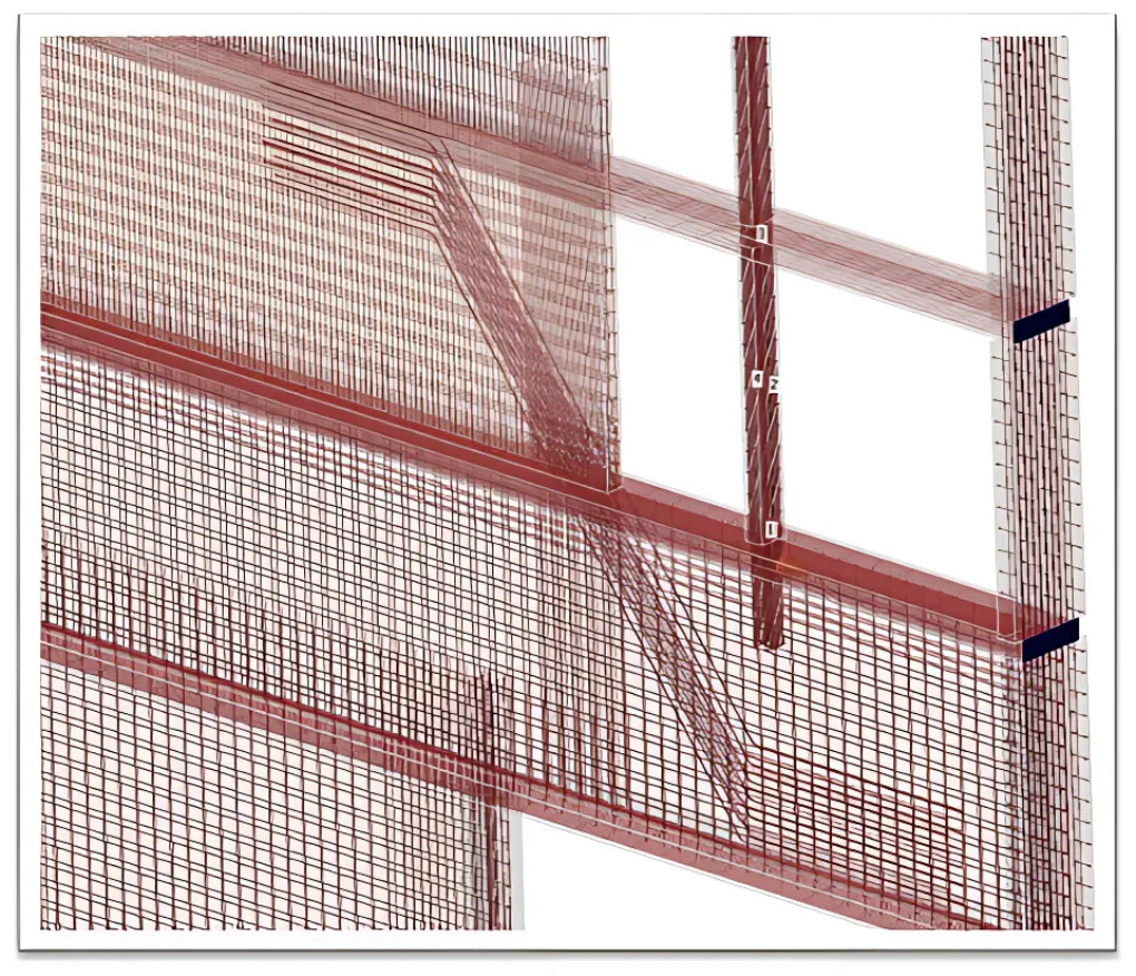 The next step was to check the structure in IDEA StatiCa Detail for ultimate limit state and also serviceability limit state. All this is possible thanks to a special finite-element model that models the reinforcement as 1D elements. This makes it possible to calculate the behavior of the structure based on the actual reinforcement and there is no restriction based on the shape of the structure or the reinforcement.
