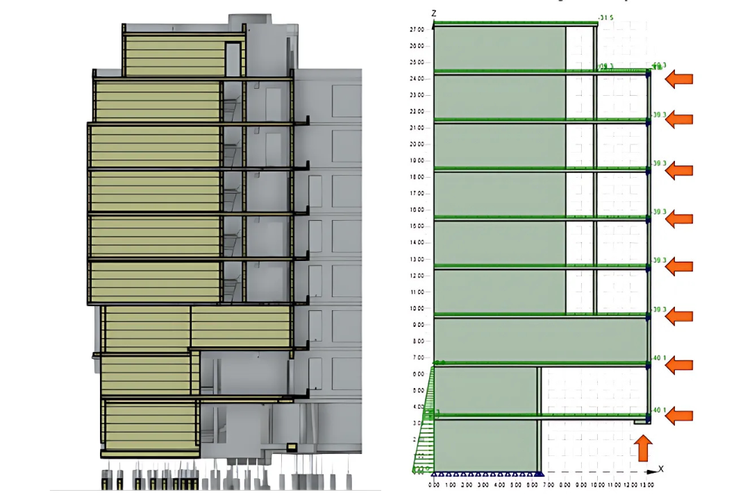 The structural layout of the building raised several questions regarding the actual interaction of the wall and horizontal elements. In the case of this wall, the main issue was the influence of the vertical stiffness of the beam located at the bottom of the wall. Since the material in a common FEM model is traditionally considered as linear, there was a concern that the stiffness of the beam would be overestimated on the "unsafe side".