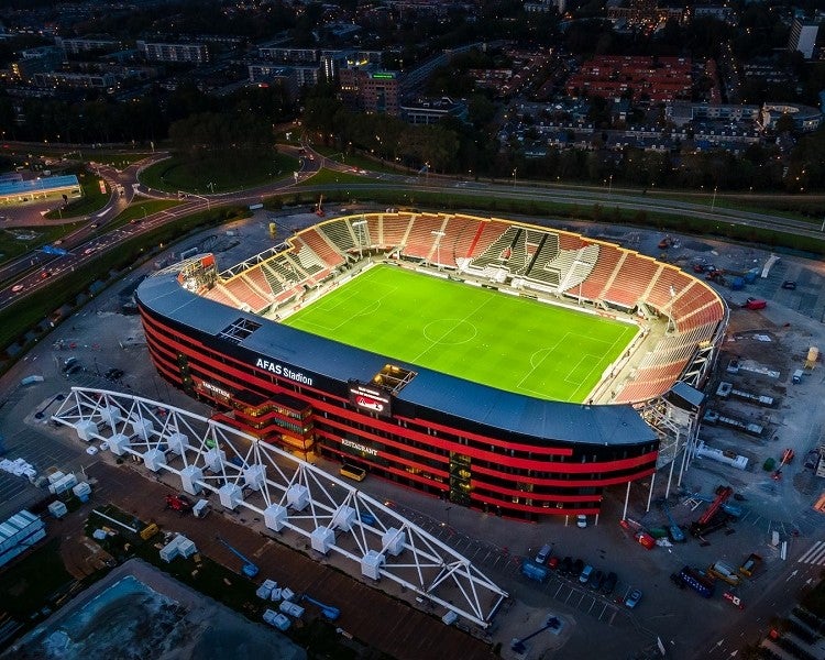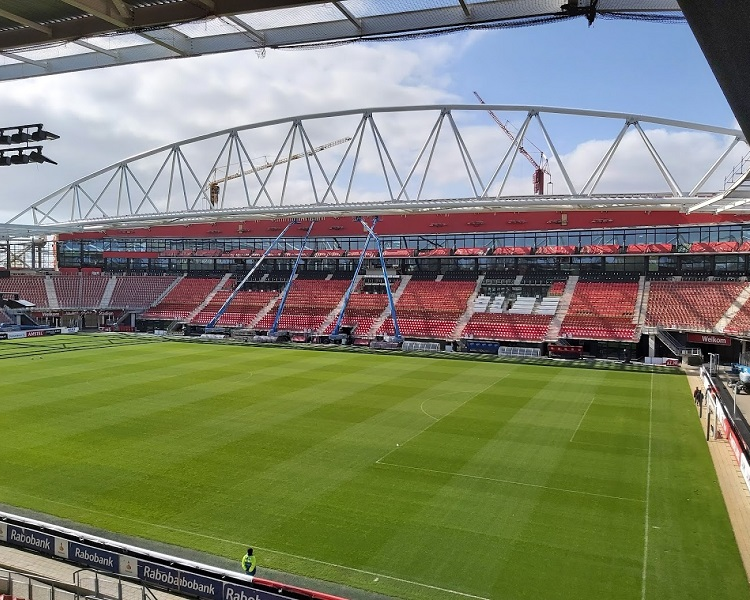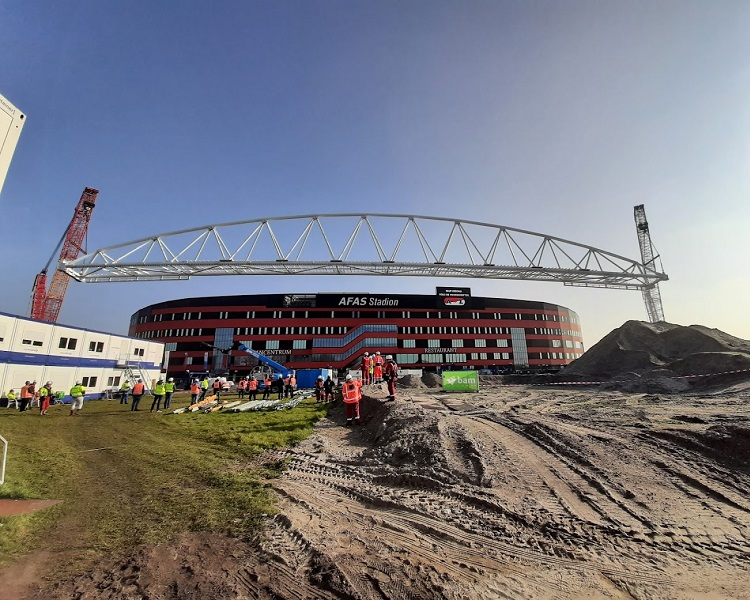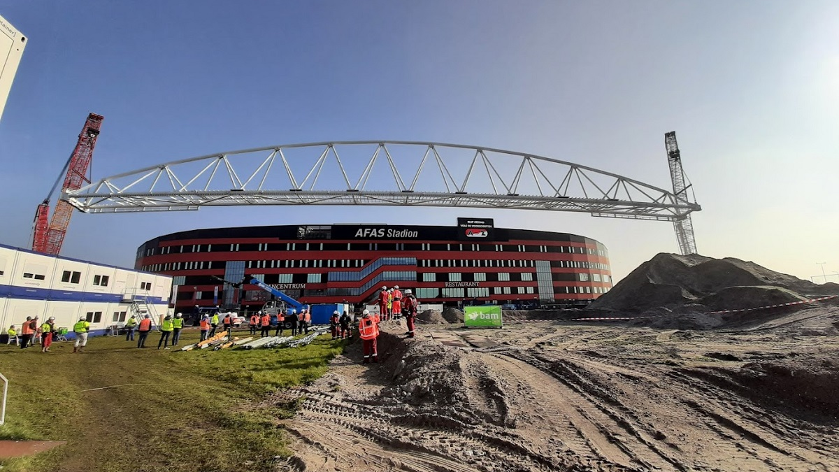 The AFAS Stadium (AZ Stadion) in Alkmaar, the Netherlands, hosts football matches and is the home of the Dutch professional football club, AZ Alkmaar. The old roof of the stadium had partly collapsed due to a storm and needed replacing.