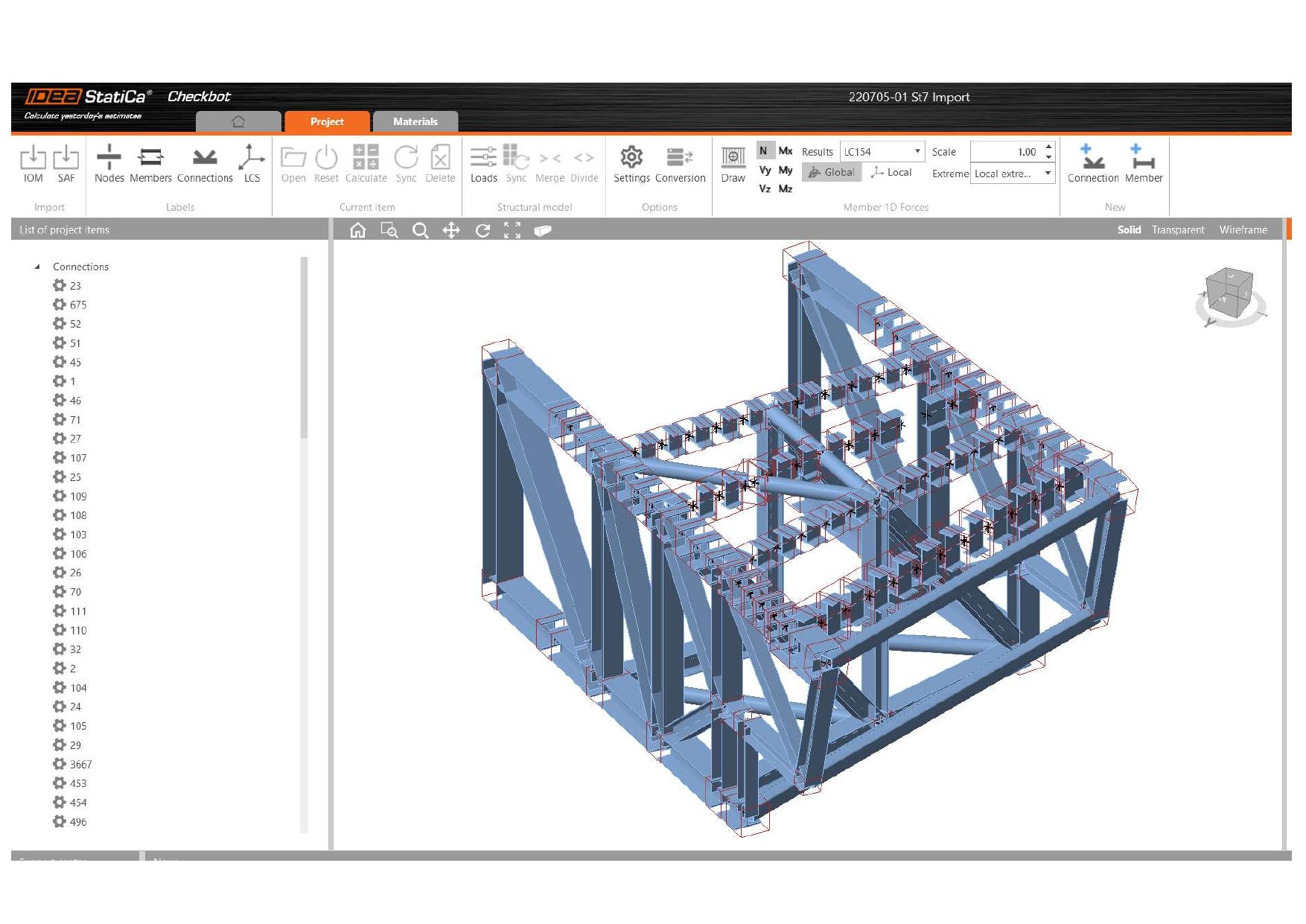 They also were able to develop a workflow where they could take the member geometry and member forces from their finite element analysis model. They set up a Python script so they could extract the data from Strand7 into the SAF file format as Strand7 does not have a BIM link. This made it possible to import the model into IDEA StatiCa through Checkbot, which was a huge advantage for the team as this meant they could transfer data without loss using IDEA StatiCa's well-documented API.