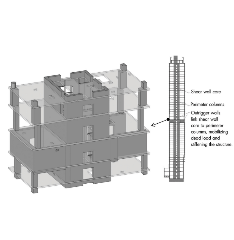 A key structural challenge was preserving an adjacent three-story historic building while maximizing floor area. To achieve this, engineers implemented walking columns, gradually shifting load-bearing columns over four floors to support the 40-plus stories above.