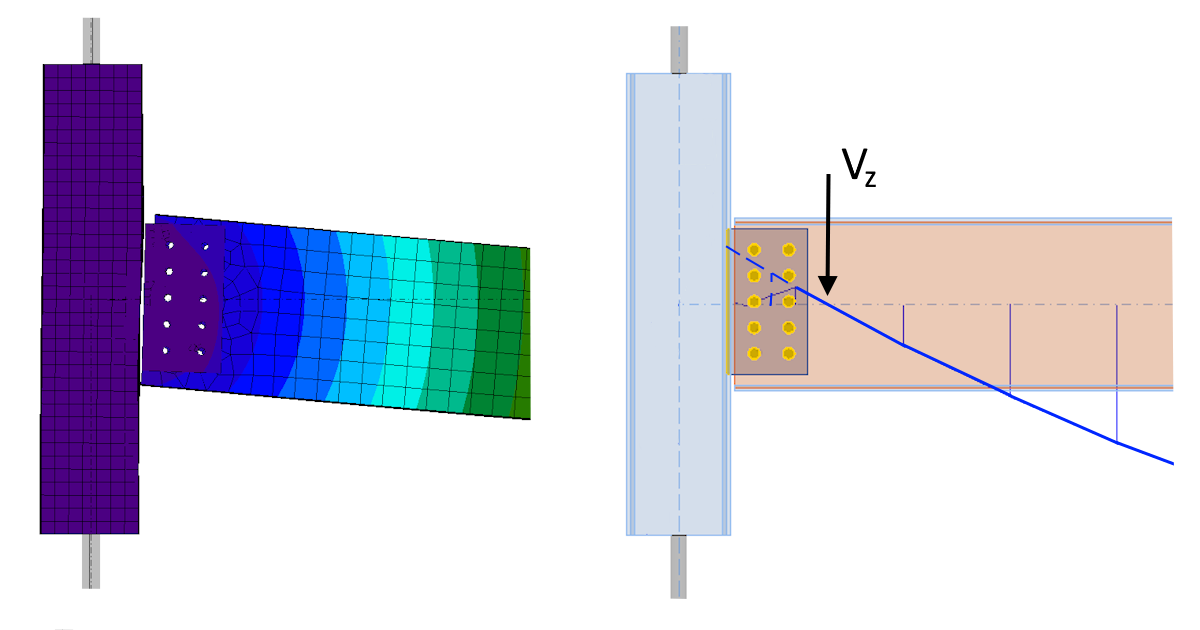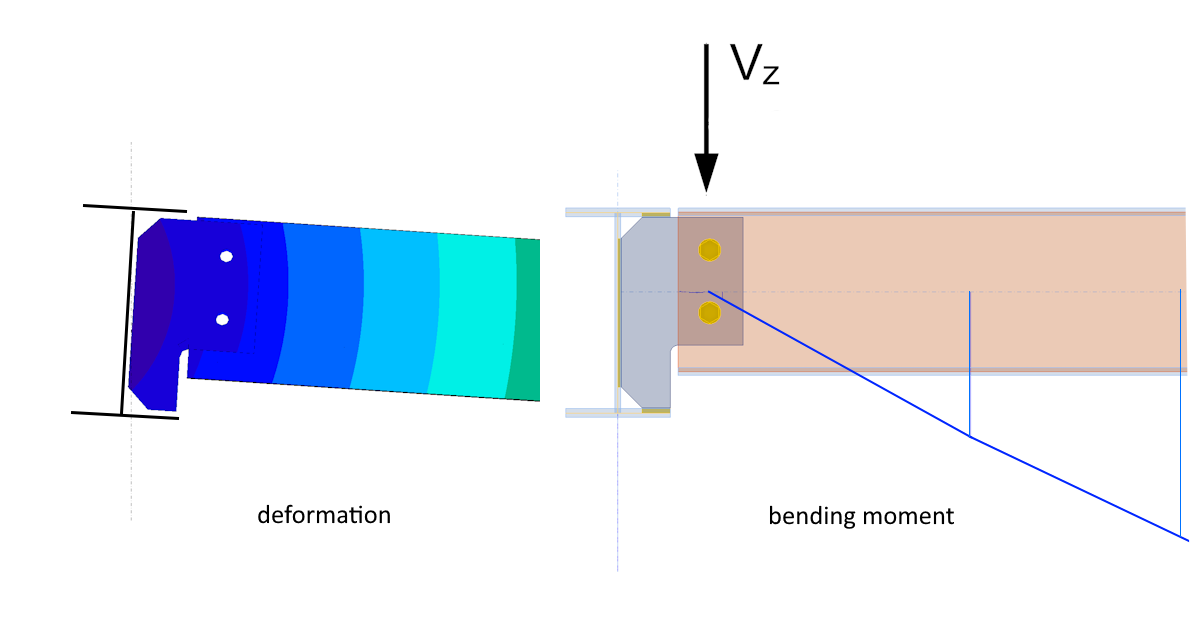 Čtenář zde může namítnout, že popsané způsoby chování smykových přípojů jsou jen hypotézy, a bylo by dobré je podpořit výpočtem. Chování jednotlivých přípojů nyní proto ověříme pomocí programu IDEA StatiCa Member. IDEA StatiCa Member umožňuje velmi přesně modelovat chování ocelových konstrukcí, nebo jejich částí. Jednotlivé prvky, nosníky a sloupy jsou modelovány prostorově pomocí deskostěnových prvků. Přípoje mezi prvky jsou modelovány pomocí Component-based Finite Element Method (CBFEM) modelu. To znamená, že jednotlivé komponenty přípoje (šrouby, přípojné pechy, svary) jsou přímo součástí výpočtového modelu a rozložení tuhostí a prostorové chování konstrukce jsou tak v matematickém modelu věrně vystiženy. Program umožňuje zpětnou integrací napětí z deskostěnových prvků zobrazit průběhy vnitřních sil na jednotlivých nosnících. Porovnejme tedy průběhy ohybových momentů stanovené pomocí programu Member v místě přípojů se schématy, která byla prezentována výše pro jednotlivé přípoje.