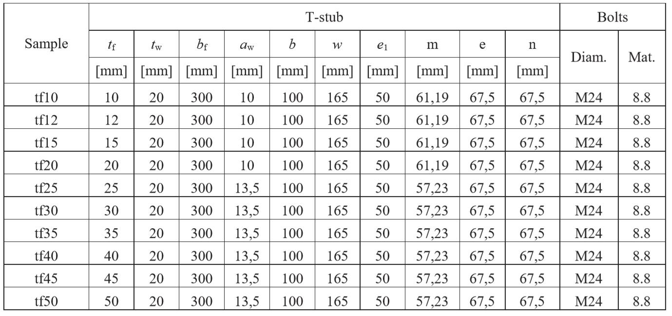 Tab. 5.1.1 Overview of the considered samples of T stubs