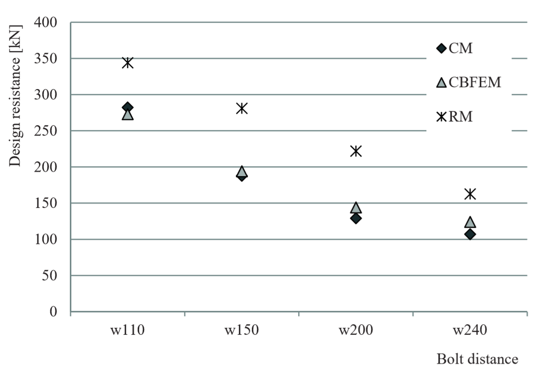 ln the case of the bolt distances results of CBFEM and CM show generally good agreement, see Fig. 5.1.8. With increase of bolt space, CBFEM gives slightly higher resistance compared to CM. For that reason, results of RM are showed also. RM gives the highest resistance in all cases.