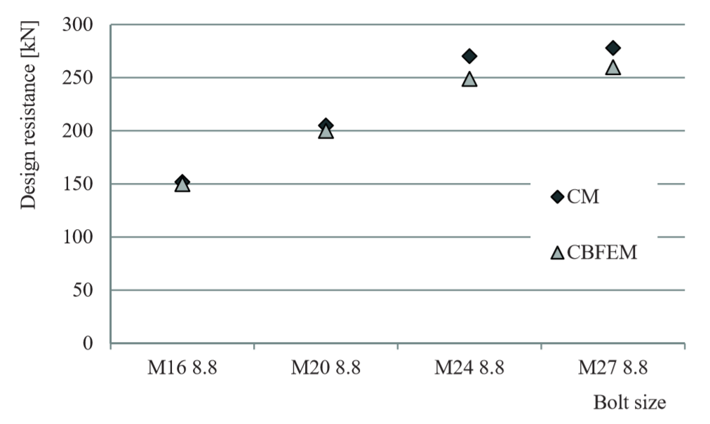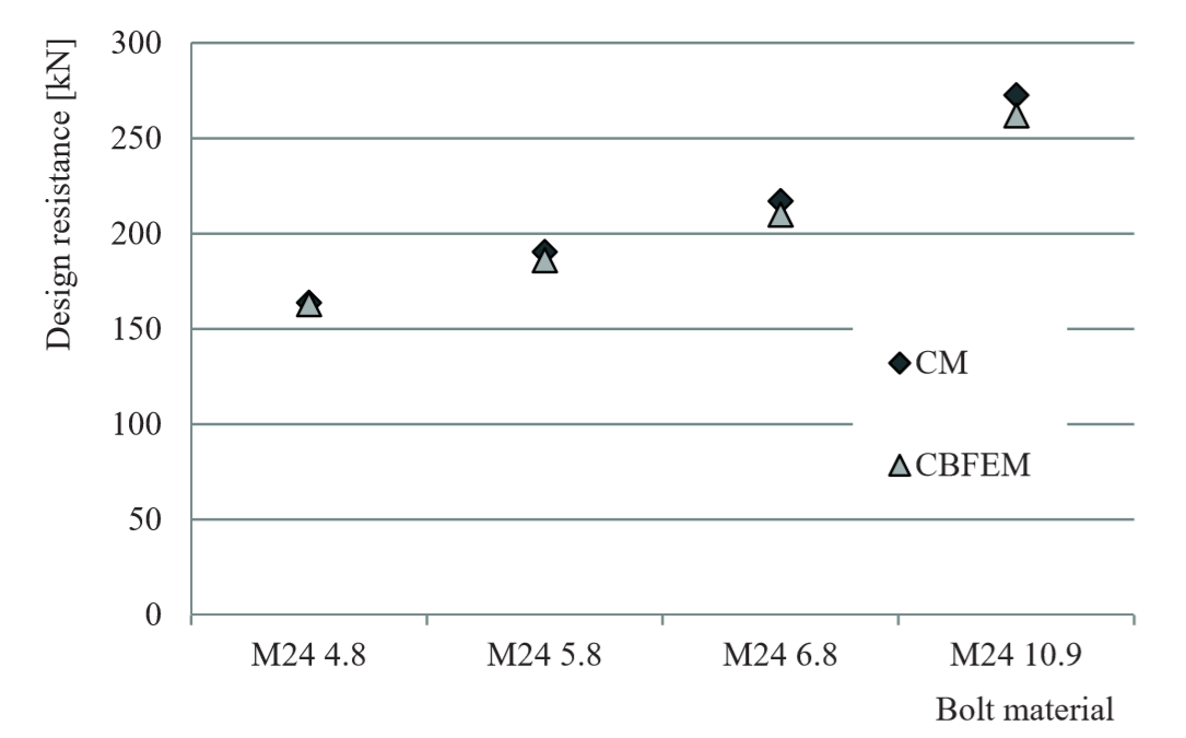 The sensitivity study of thickness of the flange shows higher resistance according to CBFEM compared to CM for samples with flange thicknesses up to 20 mm. RM gives even higher resistance for these samples, see Fig. 5.1.5. Higher resistance of both numerical models is explained by neglecting of membrane effect in CM. ln case of the bolt diameter, see Fig. 5.1.6 and bolt material, Fig. 5.1.7, respectively, correspond results of CBFEM and CM. Due to a good agreement of both methods, results of RM are not required.