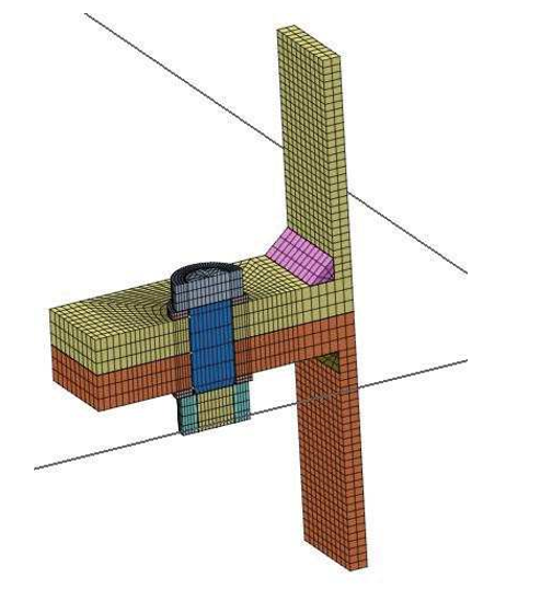 ln cases, where the CBFEM gives method higher resistance, initial stiffness or deformation capacity. Research FEM model (RM) from brick elements validated on experiments (Godrich et al, 2013) is used to verify the CBFEM model. RM is created in Midas FEA software of hexahedral and octahedral solid elements, see Fig. 5.1.2 Mesh sensitive study was provided to reach proper results in adequate time. Numerical model of the bolts is based on the model by (Wu et al, 2012). The nominal diameter is considered in the shank and the effective core diameter is considered in the threaded part. Washers are coupled with the head and nut. Deformation caused by stripping of the threads in thread-nut contact area is modelled using interface elements. lnterface elements are unable to transfer tensile stresses. Contact elements allowing the transmission of pressure and friction are used between washers and flanges of the T-stub. One quarter of the sample was modelled using the symmetry.