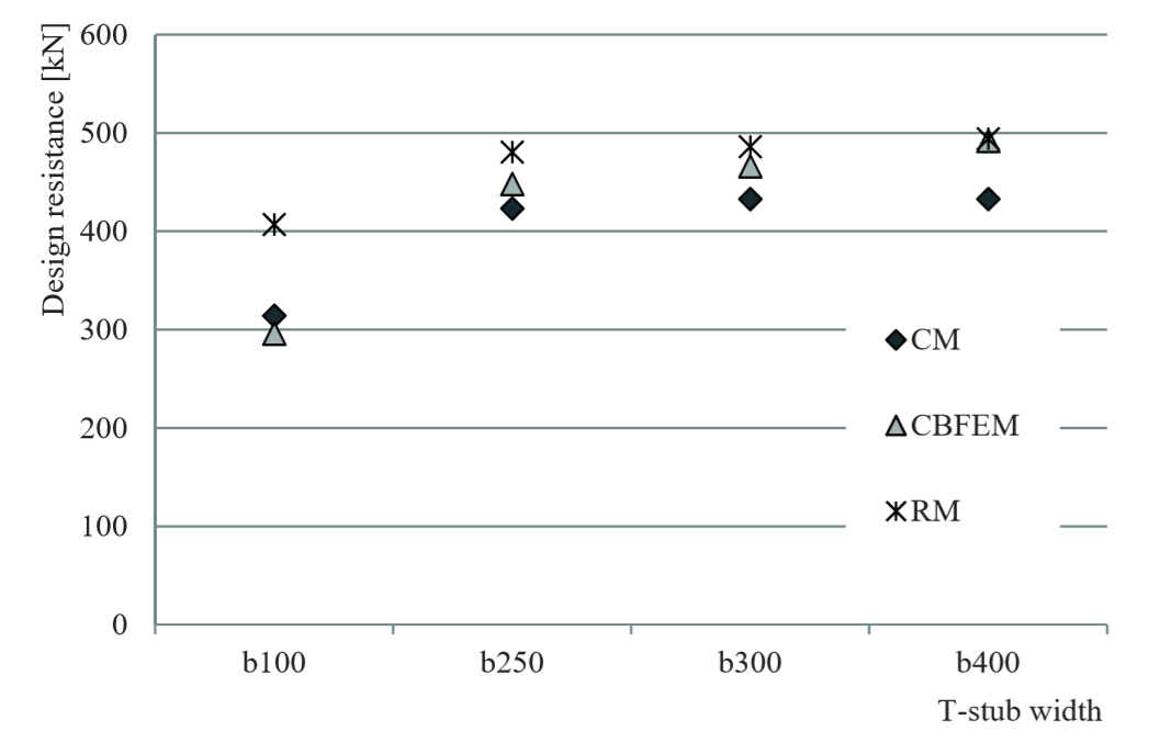 ln study of T-stub width shows CBFEM higher resistance compared to CM with increase of width. Results of RM were prepared, which gives again the highest resistance in all cases, see Fig. 5.1.9.