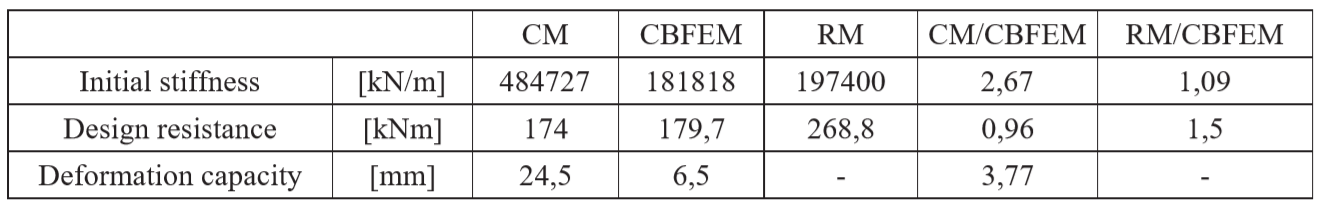 To show the prediction of the CBFEM model, results of the studies were summarized in graph comparing resistances by CBFEM and component method, see Fig. 5.1.10. The results show that the difference of the two calculation methods is mostly up to 10 %. ln cases with CBFEM/CM > 1,1 accuracy of CBFEM was verified by the results of RM which gives highest resistance in all selected cases.