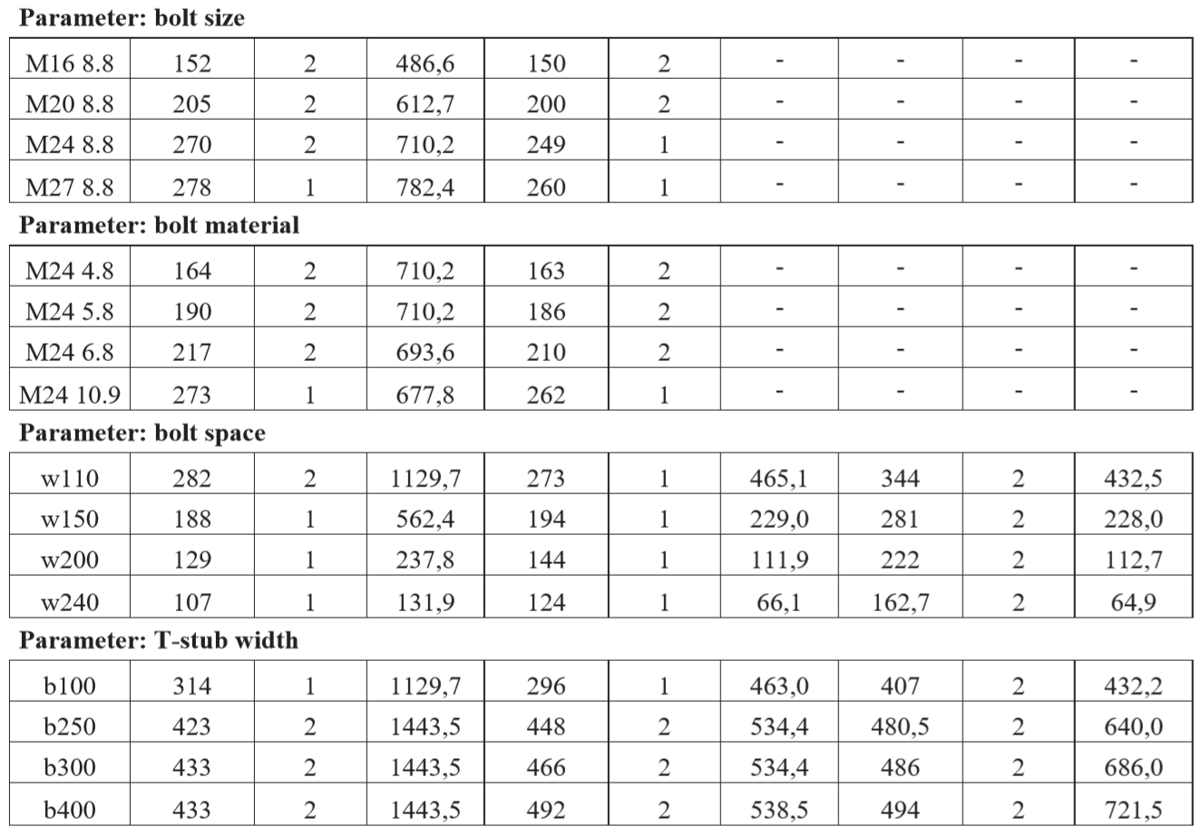 Design resistances calculated by CBFEM were compared with the results of CM and RM in the next step. The comparison was focused on the deformation capacity and determination of the collapse mode too. All results are ordered in Tab. 5.1.3. The study was performed for five parameters: thickness of the flange, bolt size, bolt material, bolt space and T-stub width.