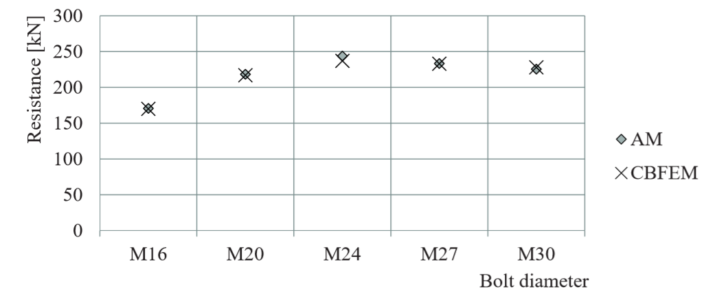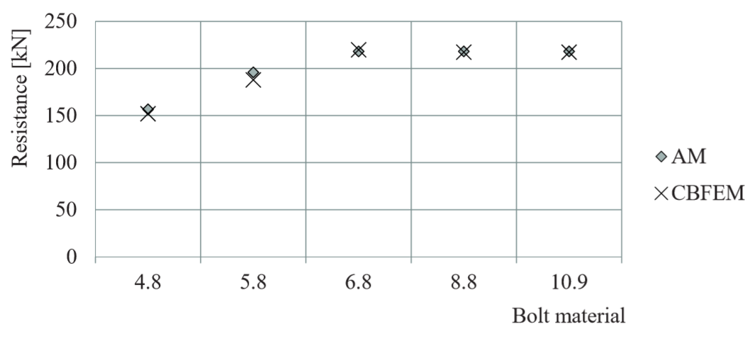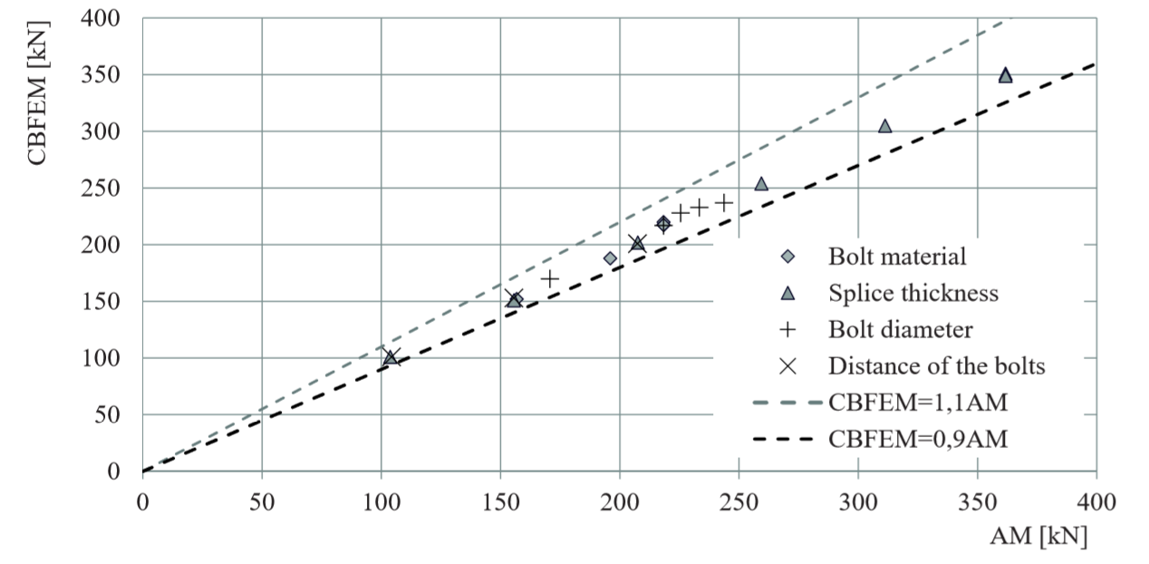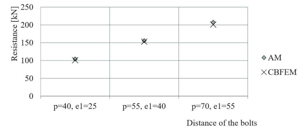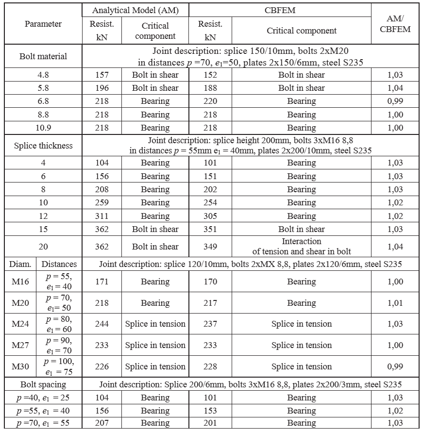 Design resistances calculated by CBFEM were compared with results of analytical model (AM). Results are summarised in Tab. 5.2.1. The parameters are bolt material, splice thickness, bolt diameter and bolt distances, see Figs. 5.2.1 to 5.2.4.