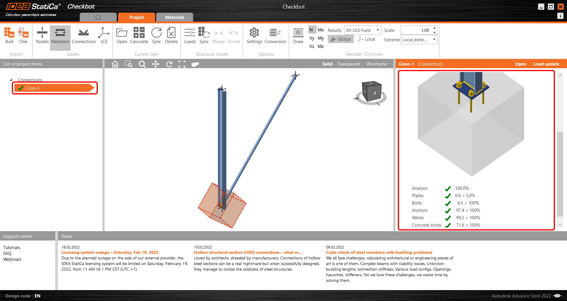 Úspěšně jste přenesli styčník z Advance Steel do IDEA StatiCa Connection pomocí aplikace Checkbot.