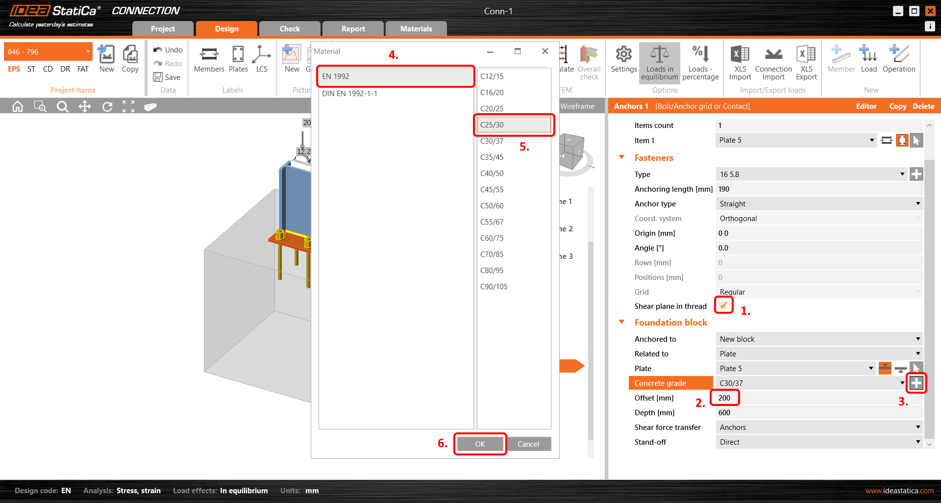 Upravte vlastnosti kotev a betonového bloku. Vyberte možnost Střihová rovina v závitu. Nastavte hodnotu Odsazení na 200 mm. Změňte Třídu betonu na C25/30.