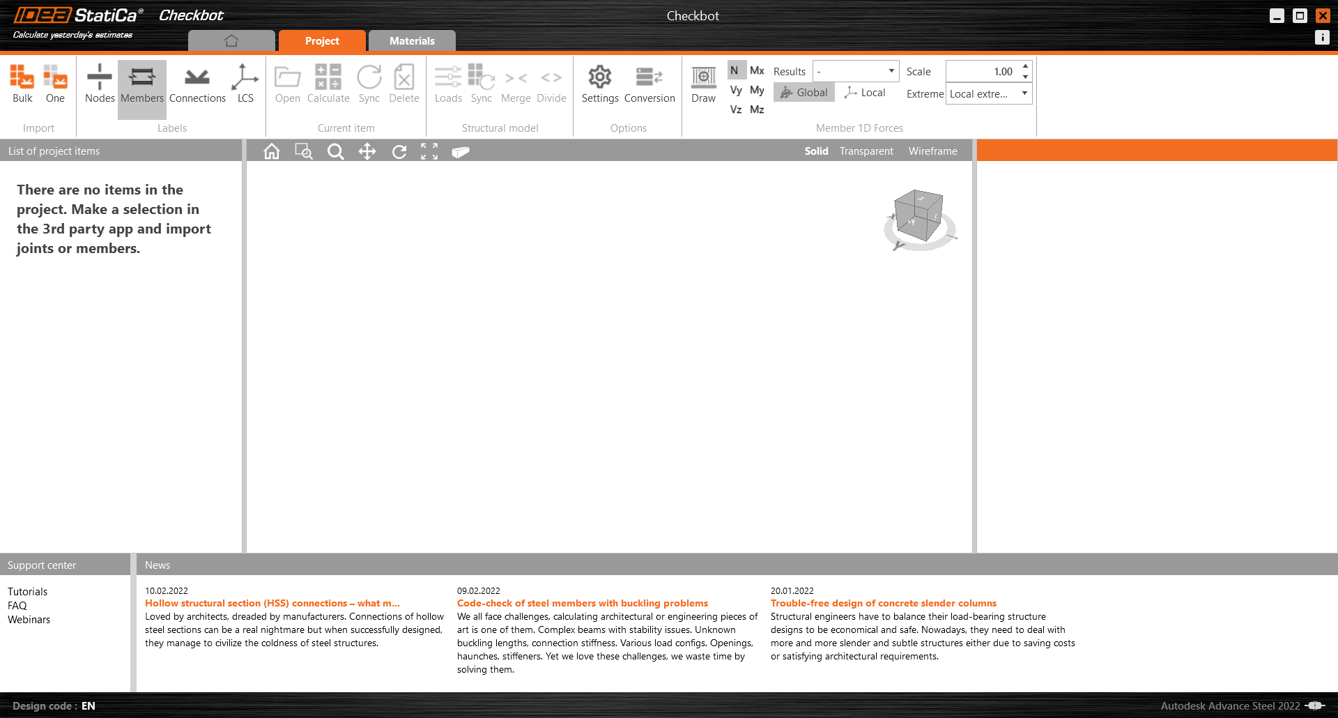 BIM propojení by mělo být již zaintegrováno. Najdete jej v horní liště pod záložkou IDEA StatiCa -> Checkbot. Tím se otevře vlastní okno aplikace Checkbot.