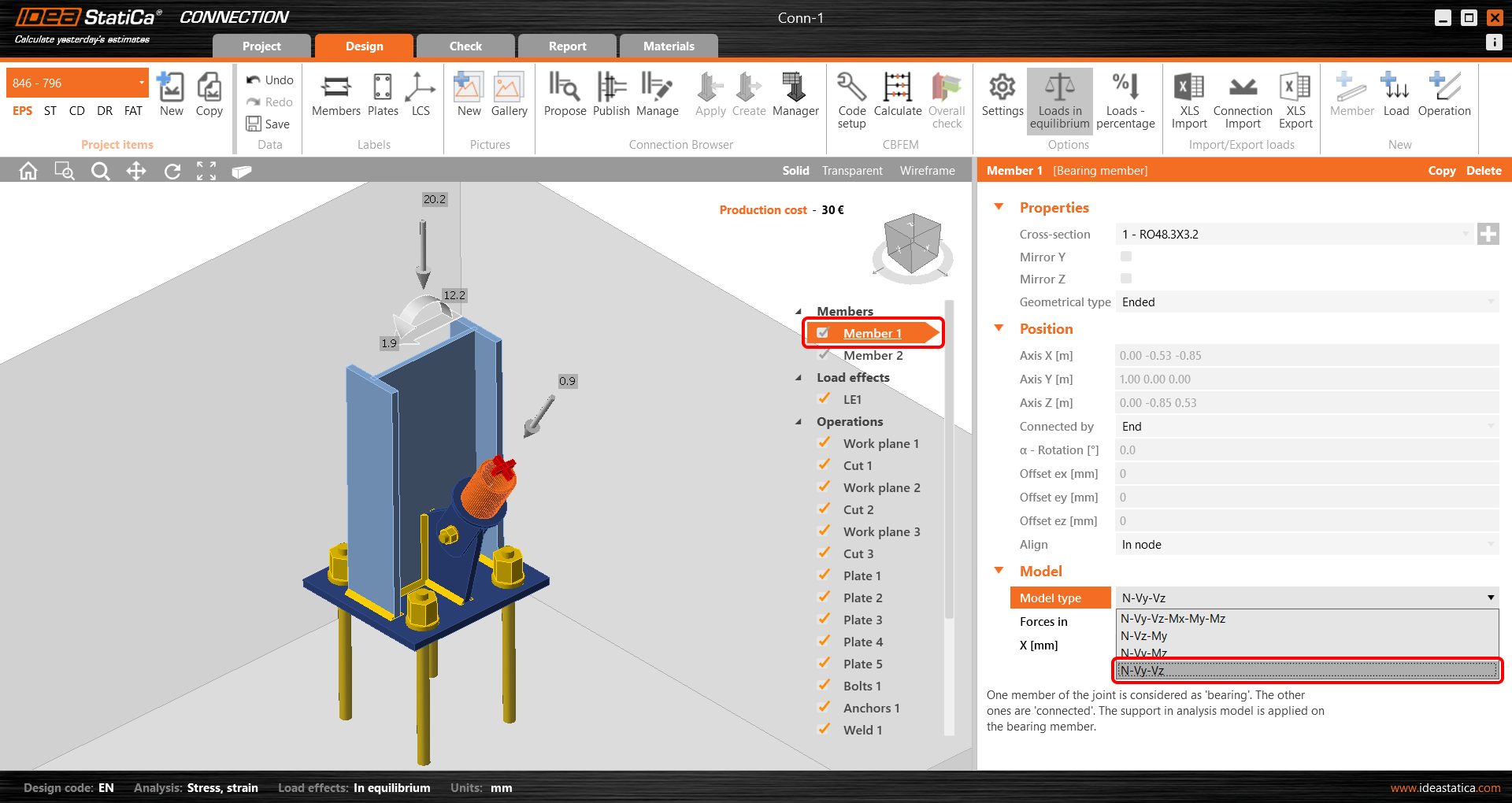 Pro diagonální ztužidlo použijeme přípoj s jedním šroubem. Pro tento typ spoje musíme také změnit Typ modelu prutu ztužidla na N-Vy-Vz. V seznamu Prvky vybereme prvek ztužidla a v rozevíracím seznamu upravíme Typ modelu.