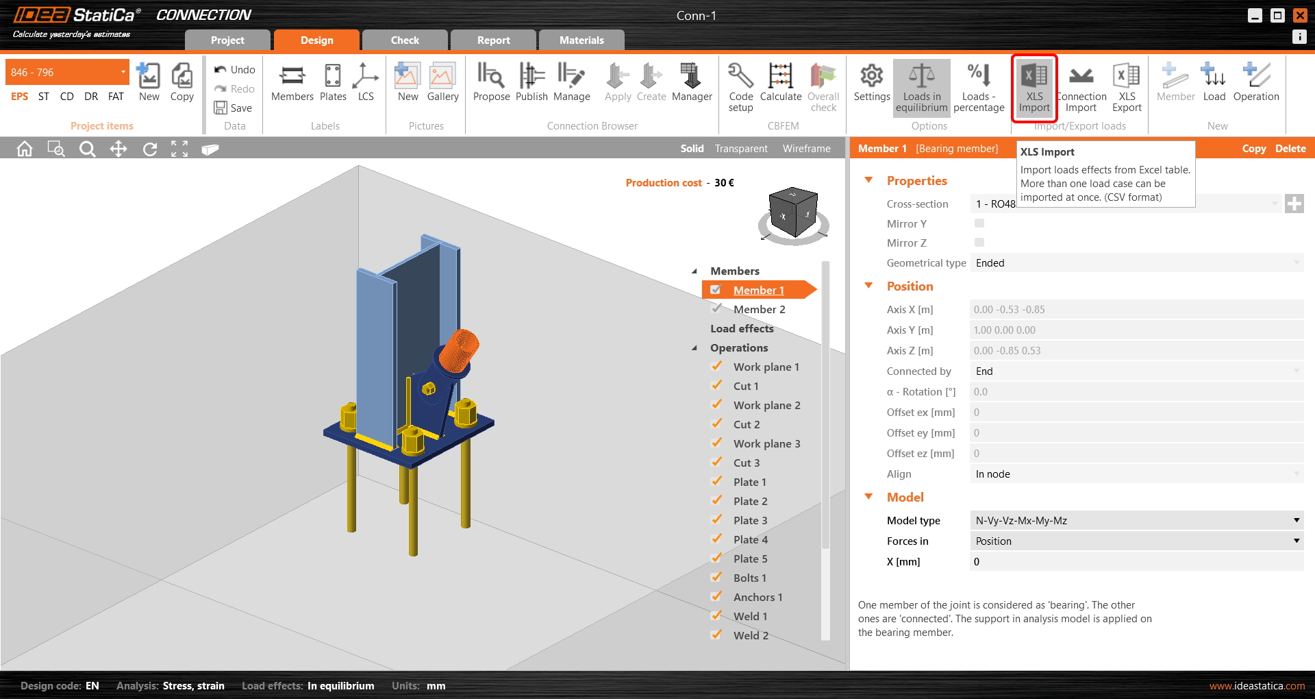 Poté v aplikaci IDEA StatiCa Connection vyberte Import z XLS v horním pásu karet.