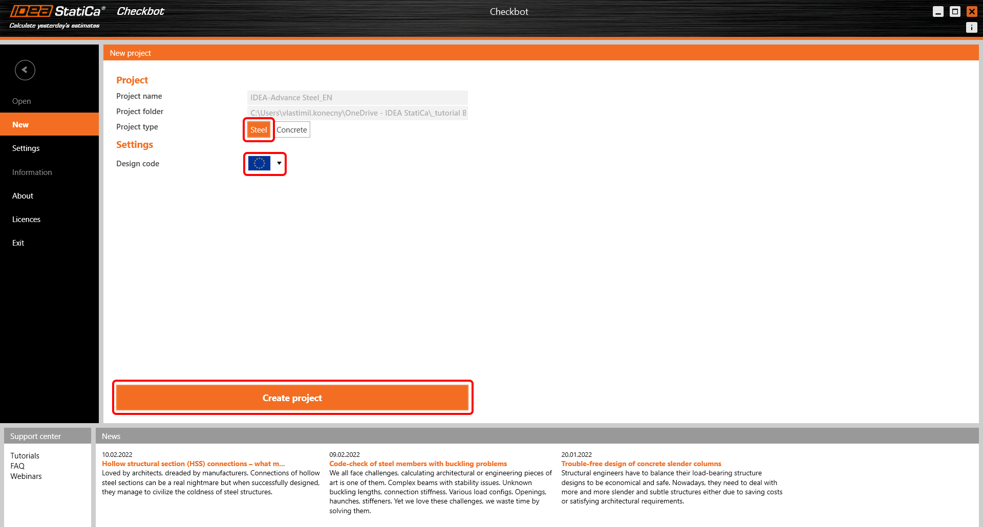 Vyberte Nový a typ projektu Ocel a normu EN. Poté klikněte na Vytvořit projekt.