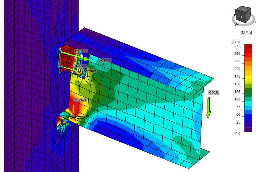 Shear load 160 kN is applied at the beam at the position of the centre of gravity of bolts on the beam web.