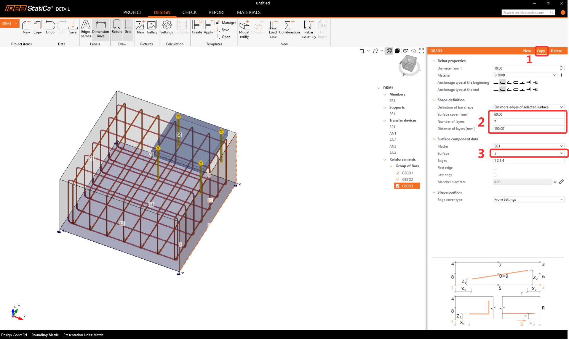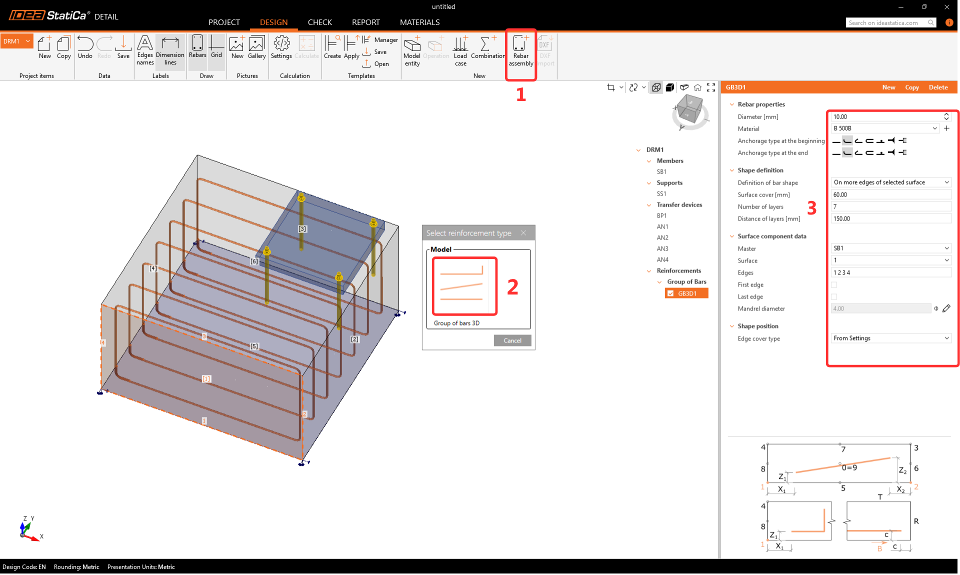 Vyberte Sestava výztuže(1)-->Skupina vložek 3D(2) a vyplňte položky Průměr, vlastnosti a geometrie(3).