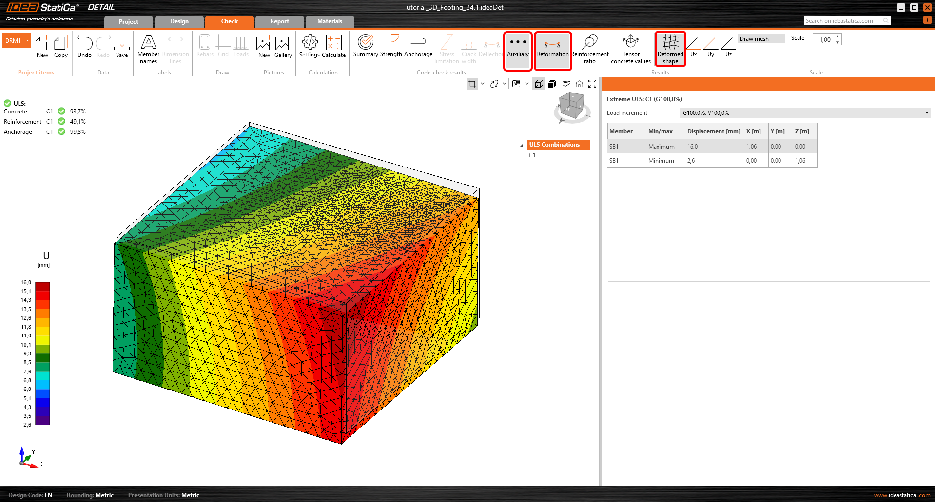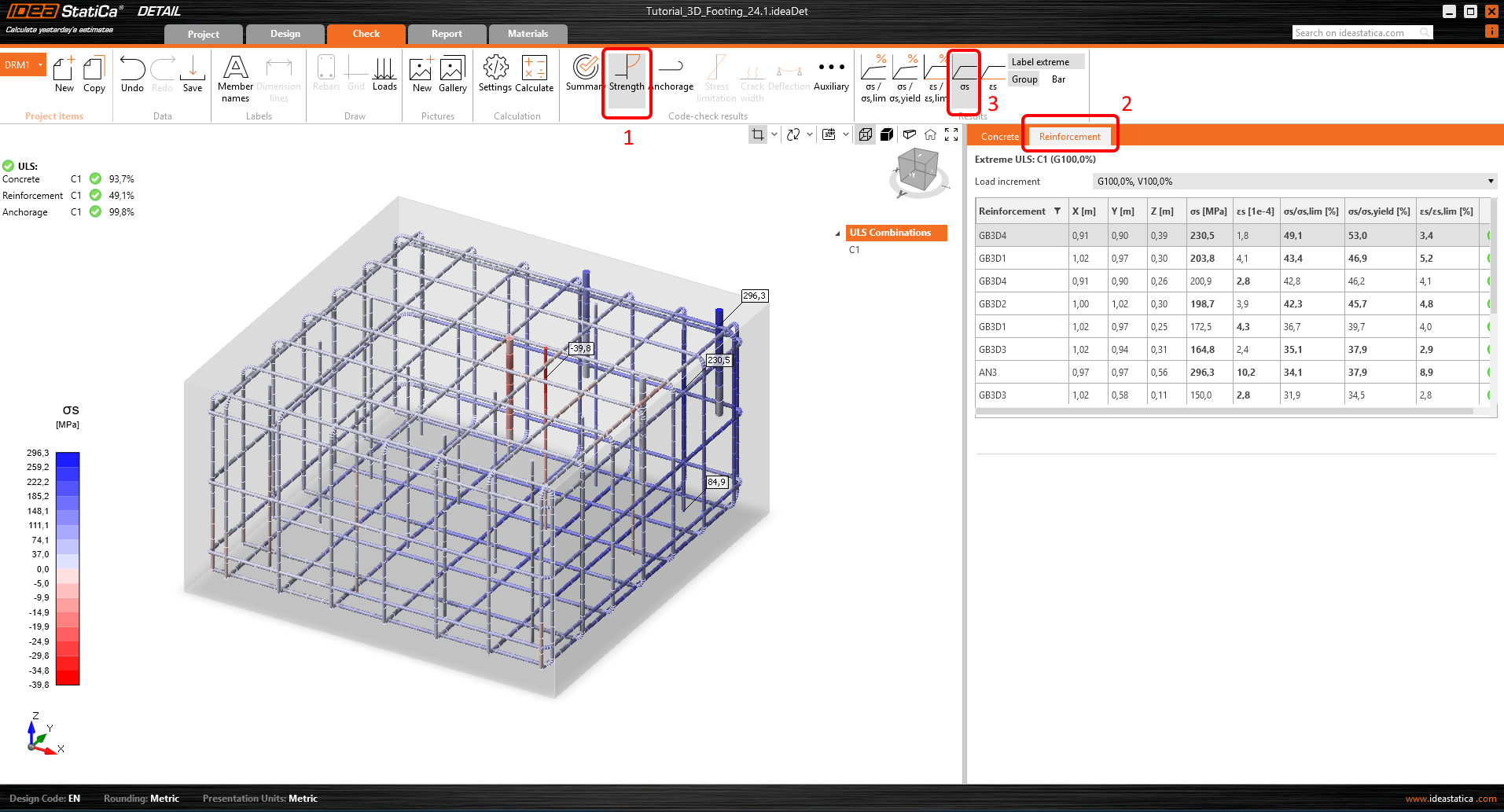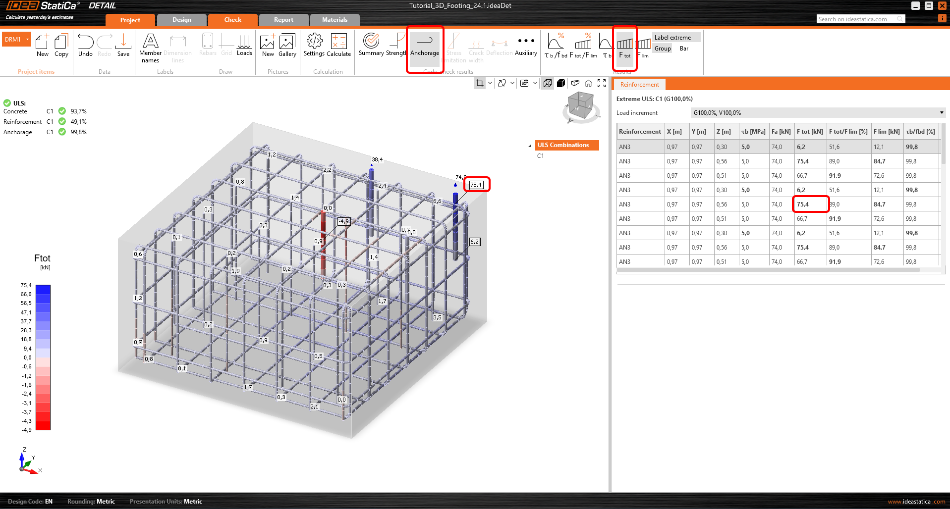 V posudku výztuže můžete zobrazit napětí všech výztuží a kotev. Můžete si všimnout, že kotva v blízkosti rohu má maximální využití.
