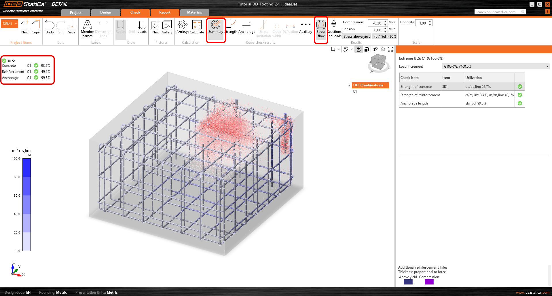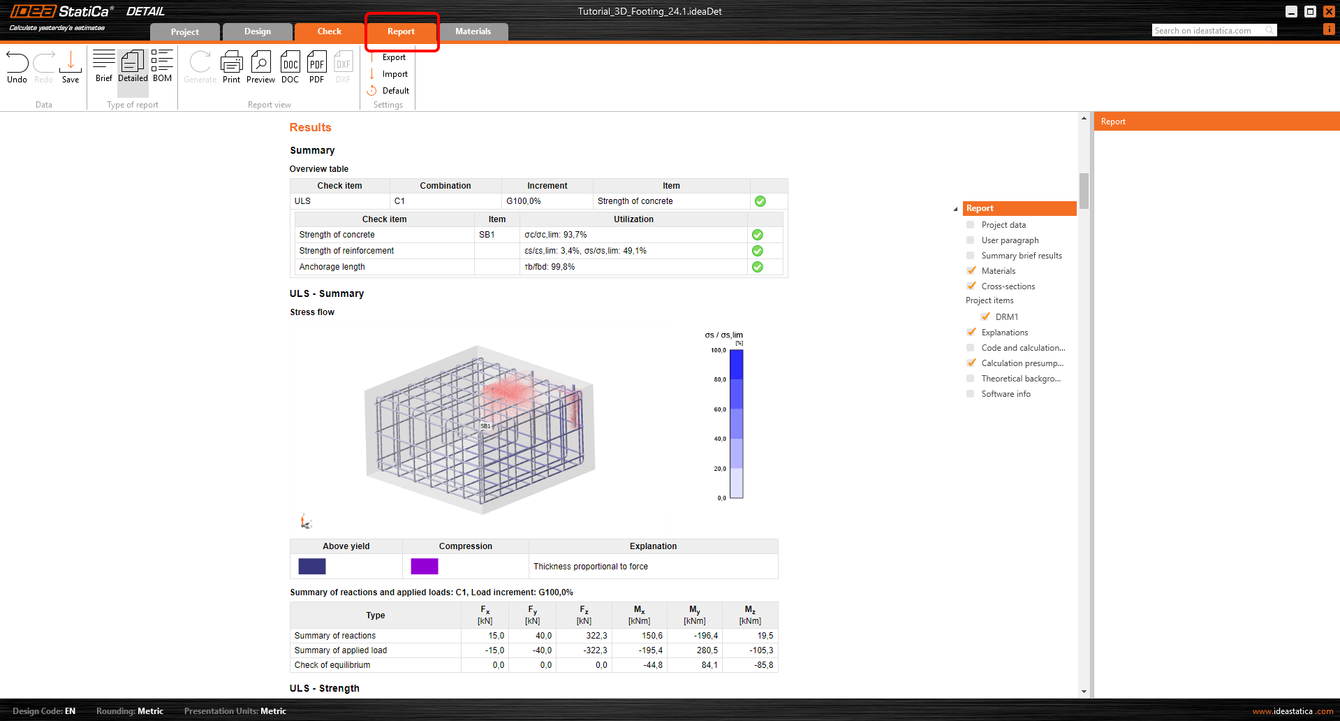 Po dokončení analýzy se v levém horním rohu obrazovky zobrazí stručný přehled výsledků. Můžete přepnout na kartu Posudek. Zobrazí se souhrnné výsledky, které ukazují tok napětí v betonu i ve výztuži.