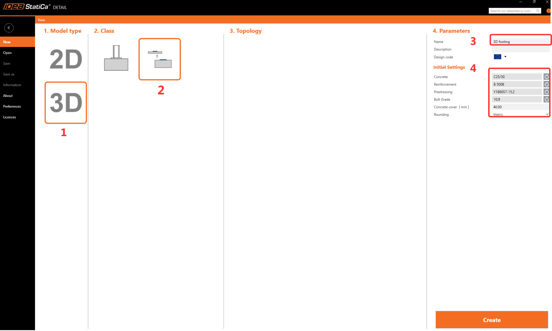 Vyberte Typ modelu 3D a prázdnou šablonu. Parametry upravte podle obrázku níže (beton C25/30, krytí betonu 40 mm). Nakonec klikněte na tlačítko Vytvořit.