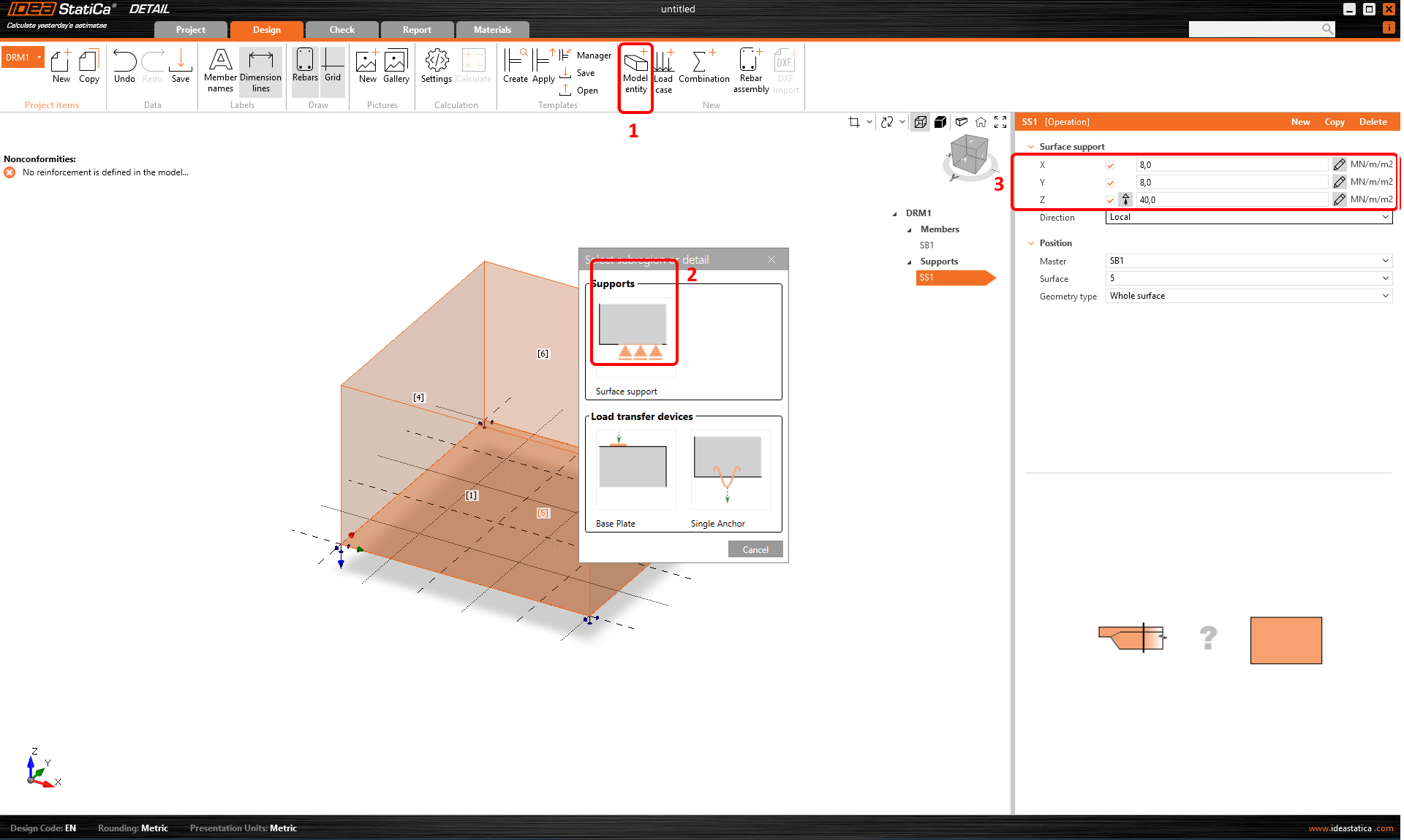 Dalším krokem je nastavení podepření bloku přidáním nové plošné podpory. Uživatel může nastavit různé tuhosti v každém směru. Ve výchozím nastavení je podpora ve svislém směru nastavena na "pouze tlak", což odráží skutečnost, že zemina nemůže přenášet žádné zatížení v tahu. Hodnota tuhosti pružiny se obvykle stanovuje ve spolupráci s geotechnikem nebo z tabulek. Obecně záleží na podloží, hloubce základu, tvaru základu a aplikovaném zatížení. Vstupní hodnota kz = 40 MN/m3 odpovídá dobrým základovým podmínkám (velmi tuhý jíl). Plošnou podporu lze nastavit na celou plochu nebo pouze na část definovanou křivkou. V tomto případě použijte výchozí nastavení Celý povrch.